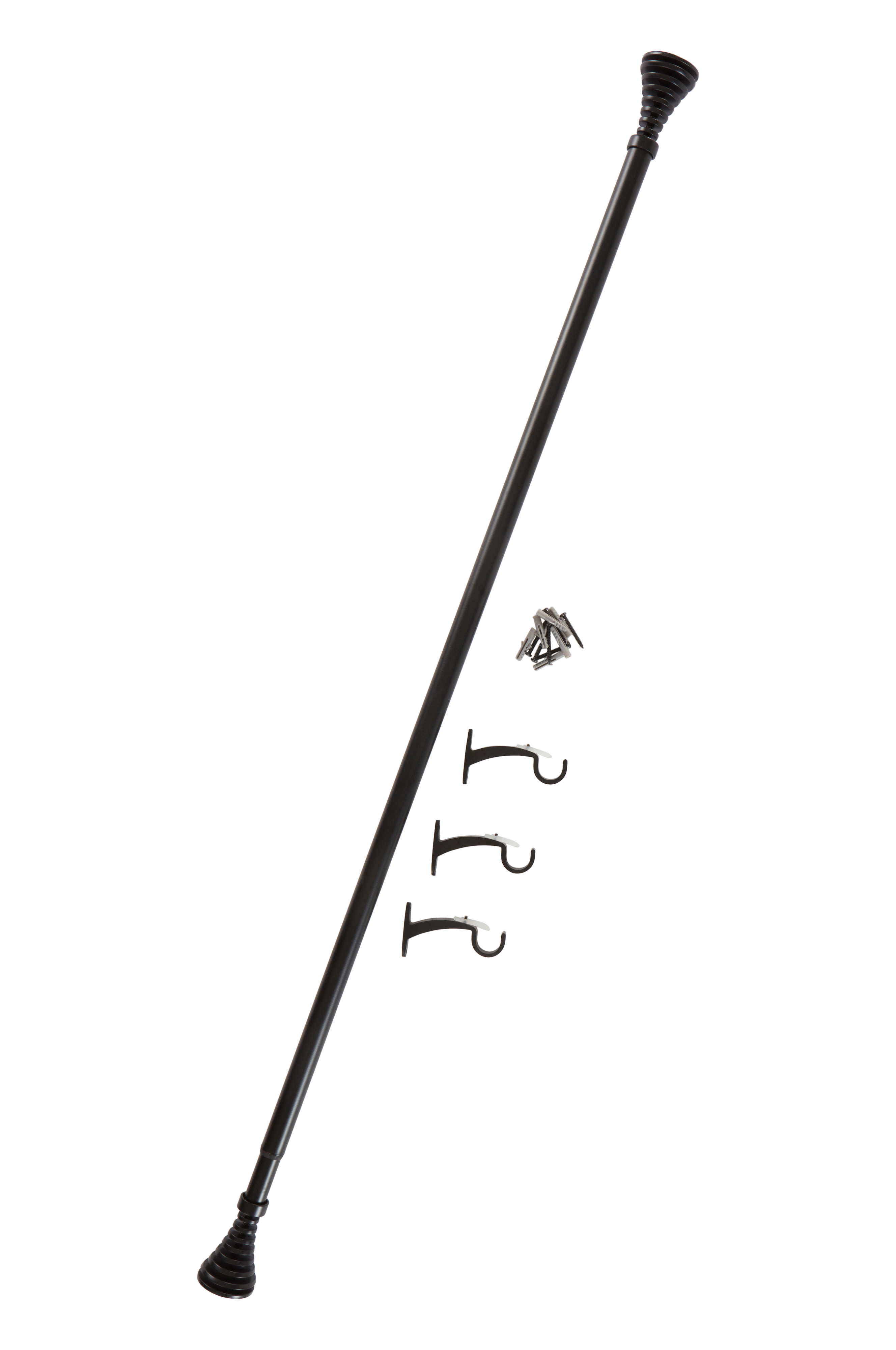 Gardinstångssetet ELLIE består av en stålstång, aluminiumfästen och ändknoppar. Den justerbara längden passar olika fönsterstorlekar, vilket eliminerar behovet av exakta mätningar. De räfflade ändknopparna ger en dekorativ touch och passar i vardagsrum, kontor, kök och sovrum.