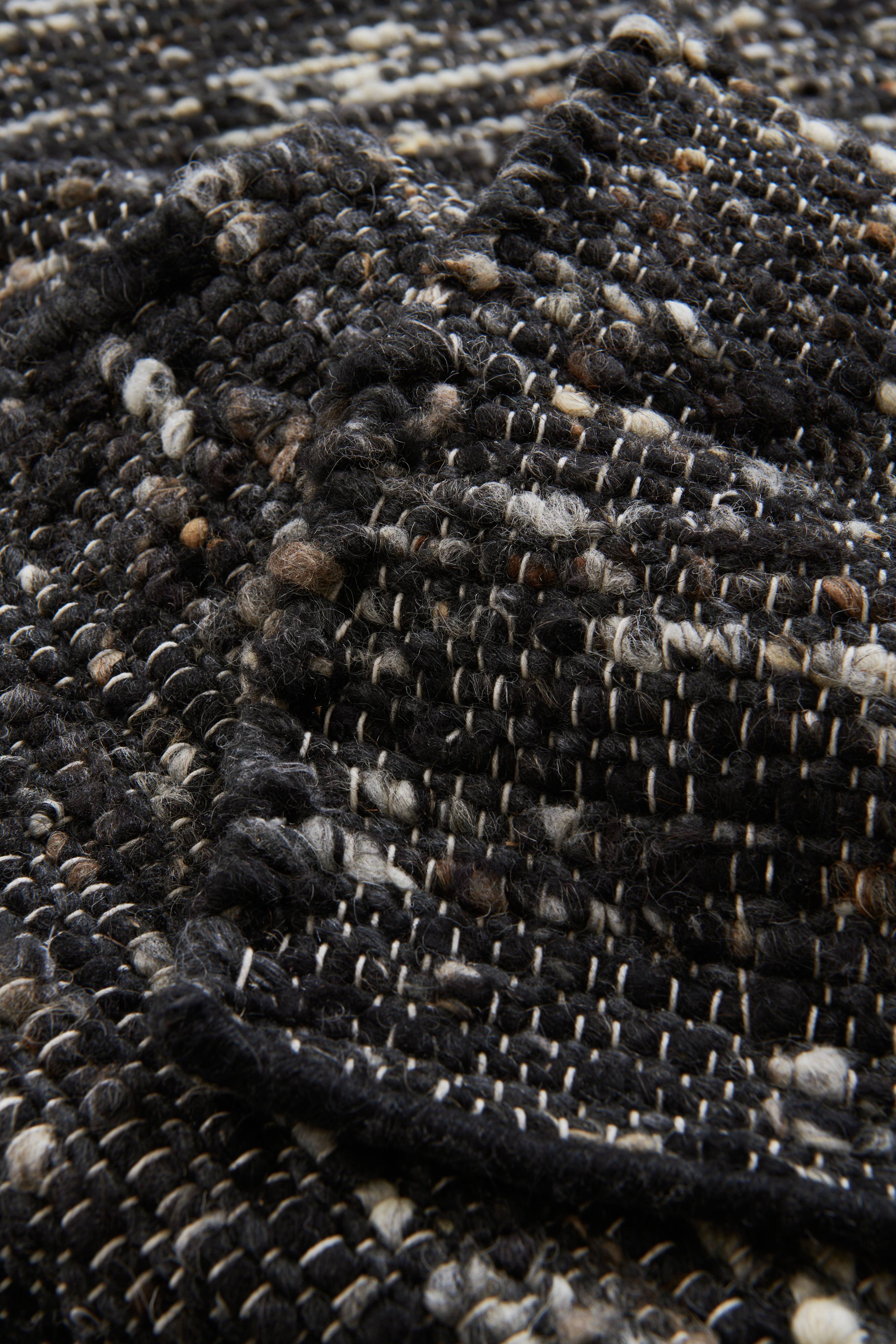 Handvävd matta av ull och polyester med varp av bomull och nylon. Den fina kvalitén gör att mattan ger ett naturligt intryck. 1800 g/m².