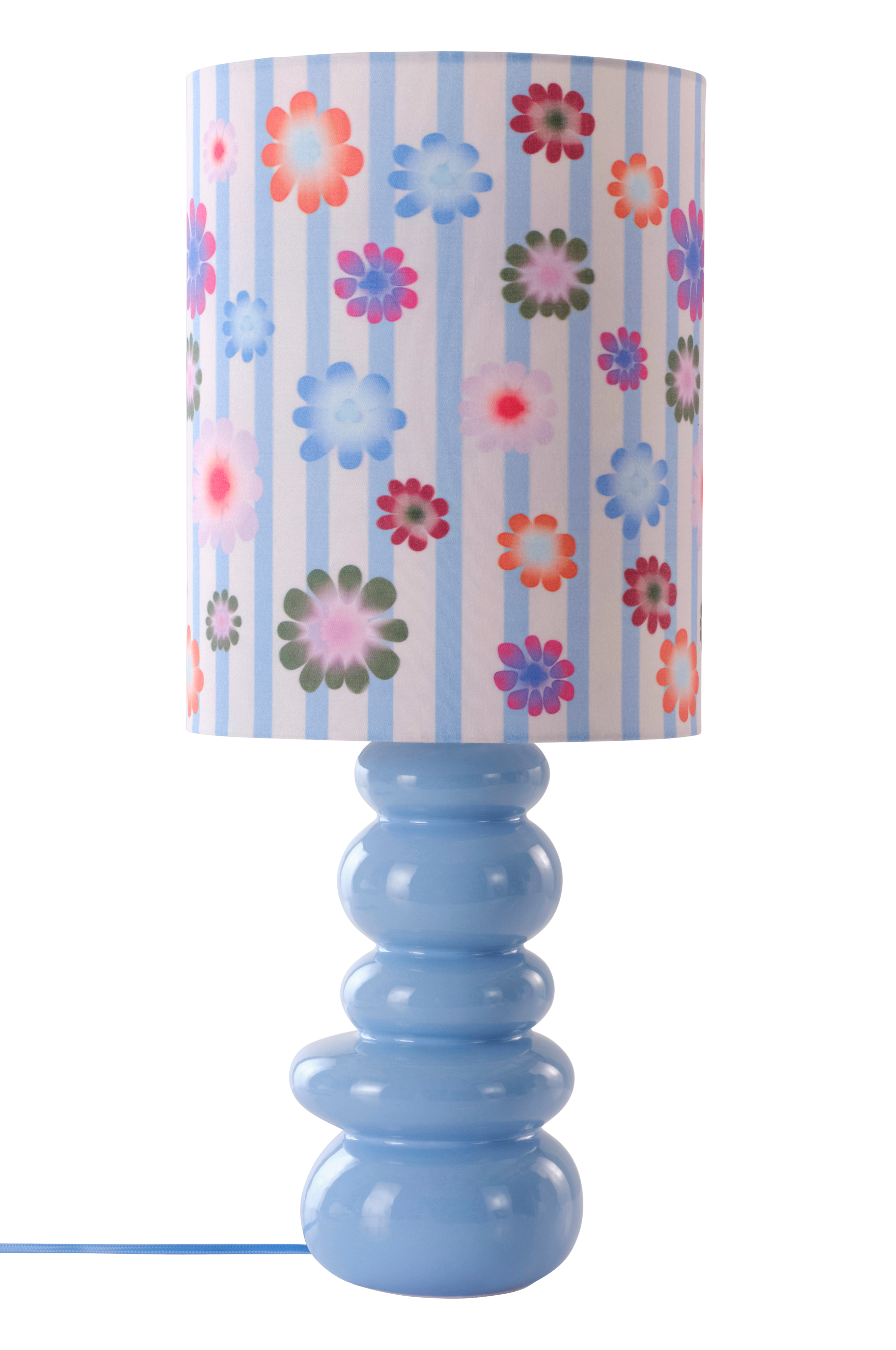 Bordslampan FONSO ger en nyckfull touch till inredningen med sitt blommönster och sin randiga design. Den kurviga basen passar både i moderna och retro miljöer och är perfekt för att lysa upp sovrum eller arbetsrum med sin livfulla charm.