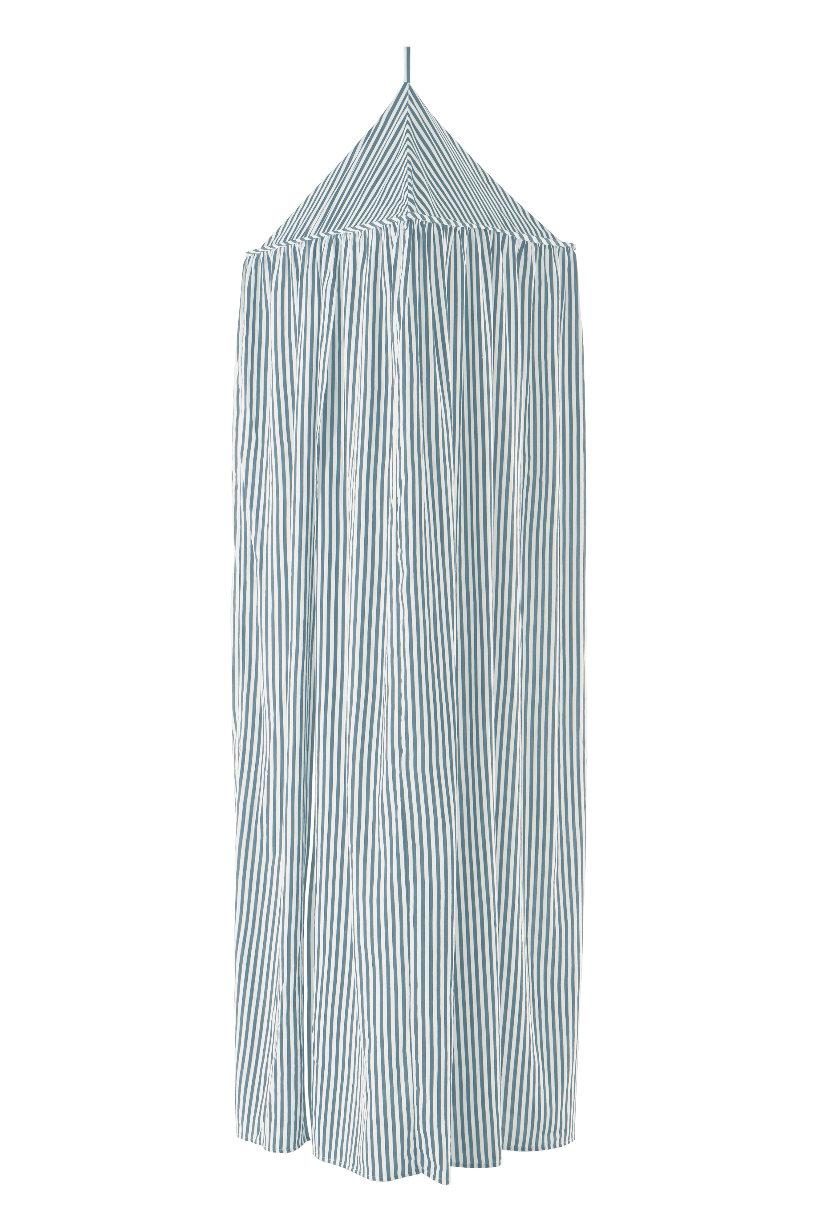 En sänghimmel i polyester och bomull med randigt mönster, öppen på framsidan, skapar en mysig atmosfär över barnets säng. FRANNY-mönstret kan användas i barnkammare med olika teman.