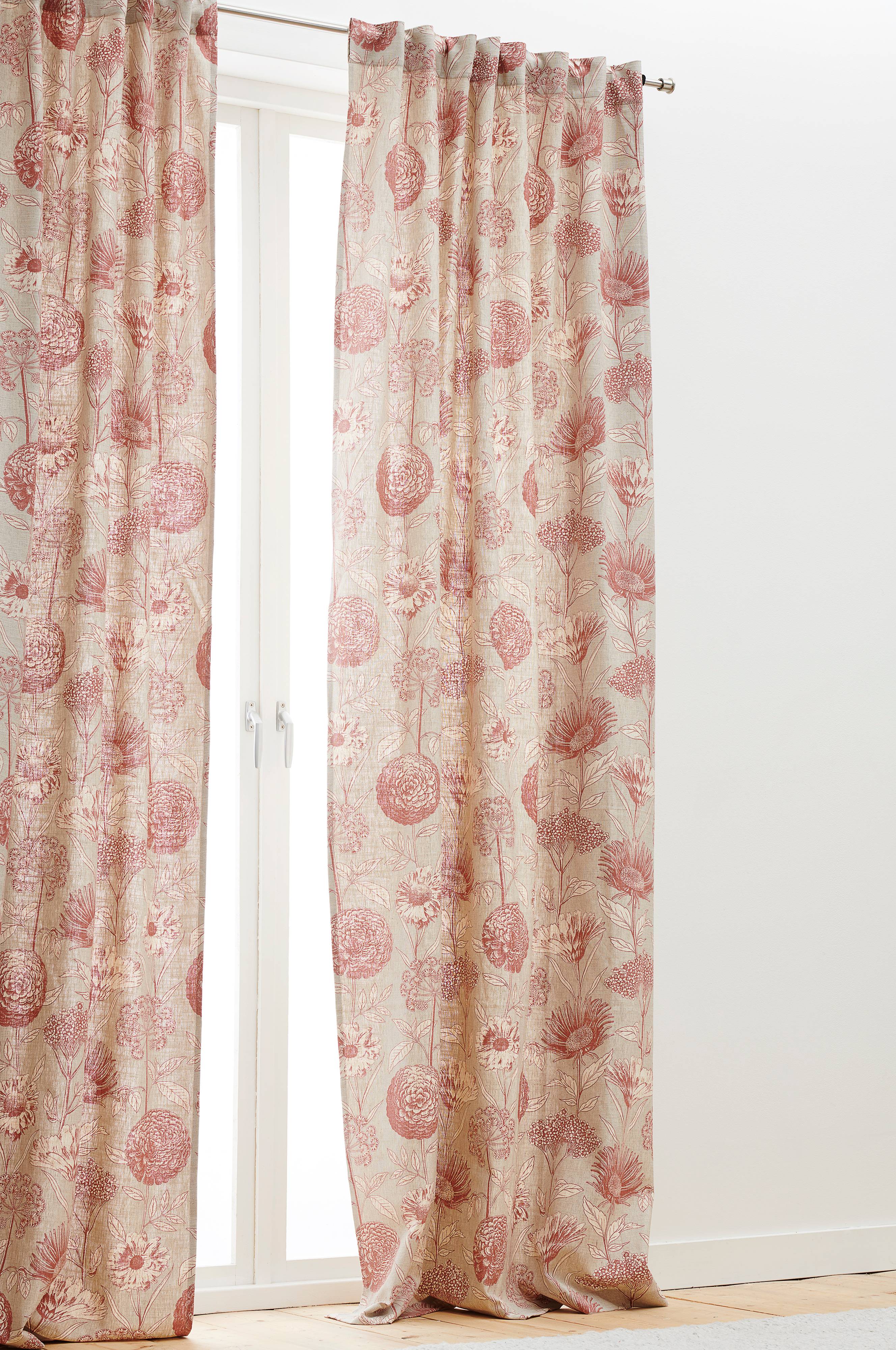 Två gardinlängder i bomullsblandning med tryckt mönster och påsytt multifunktionsband. Gardinen kan hängas upp med fingerkrokar, kanal samt dold hälla.
