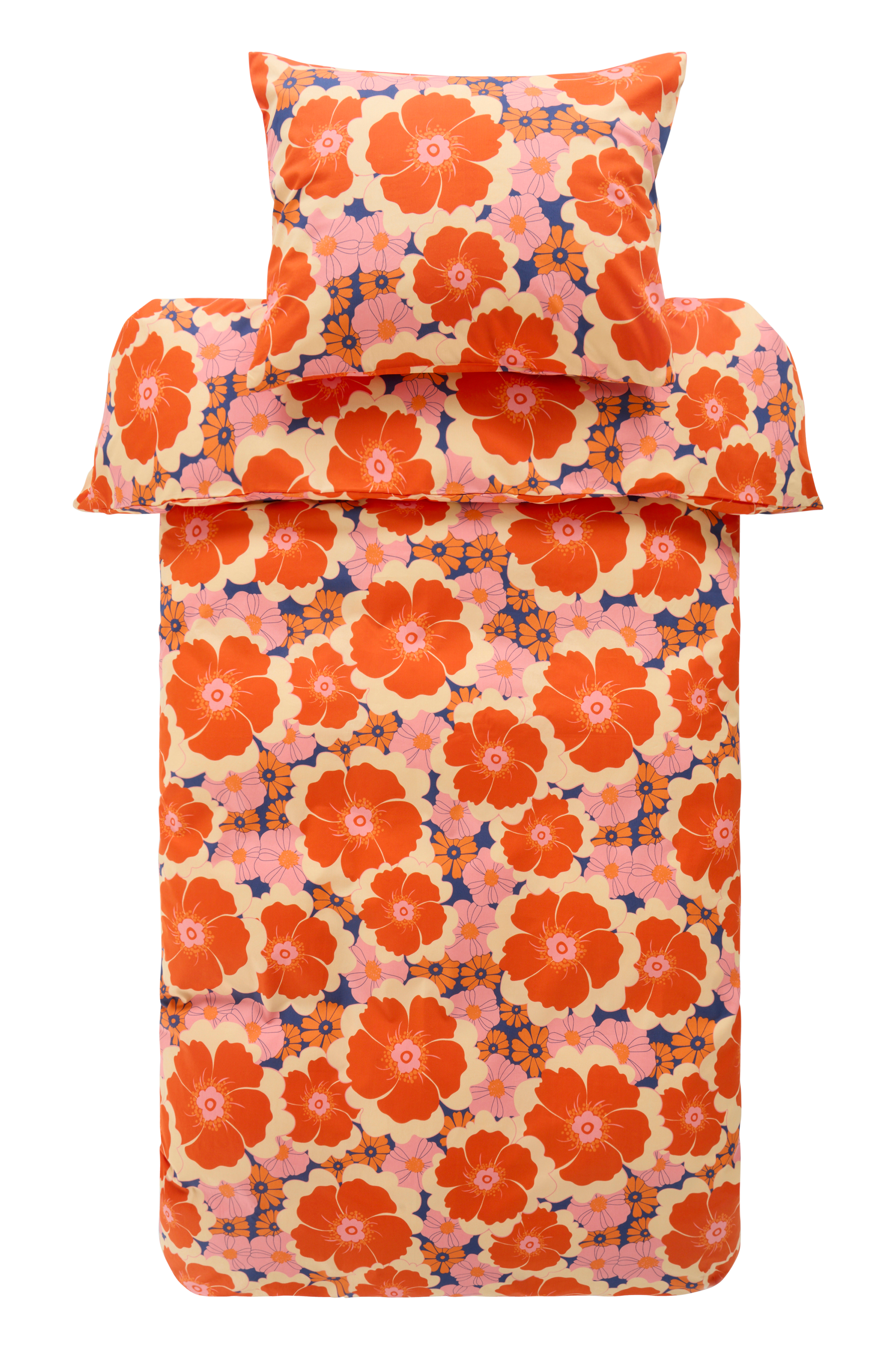 FRIDA bäddset förhöjer sovrummet med sitt retroblommönster av Maria Carlberg. Tillverkad av krispig bomullspercale som ger en mjuk känsla som andas och ger en vilsam sömn. Detta set innehåller ett påslakan och örngott med praktiska handhål och dolda tryckknappar.