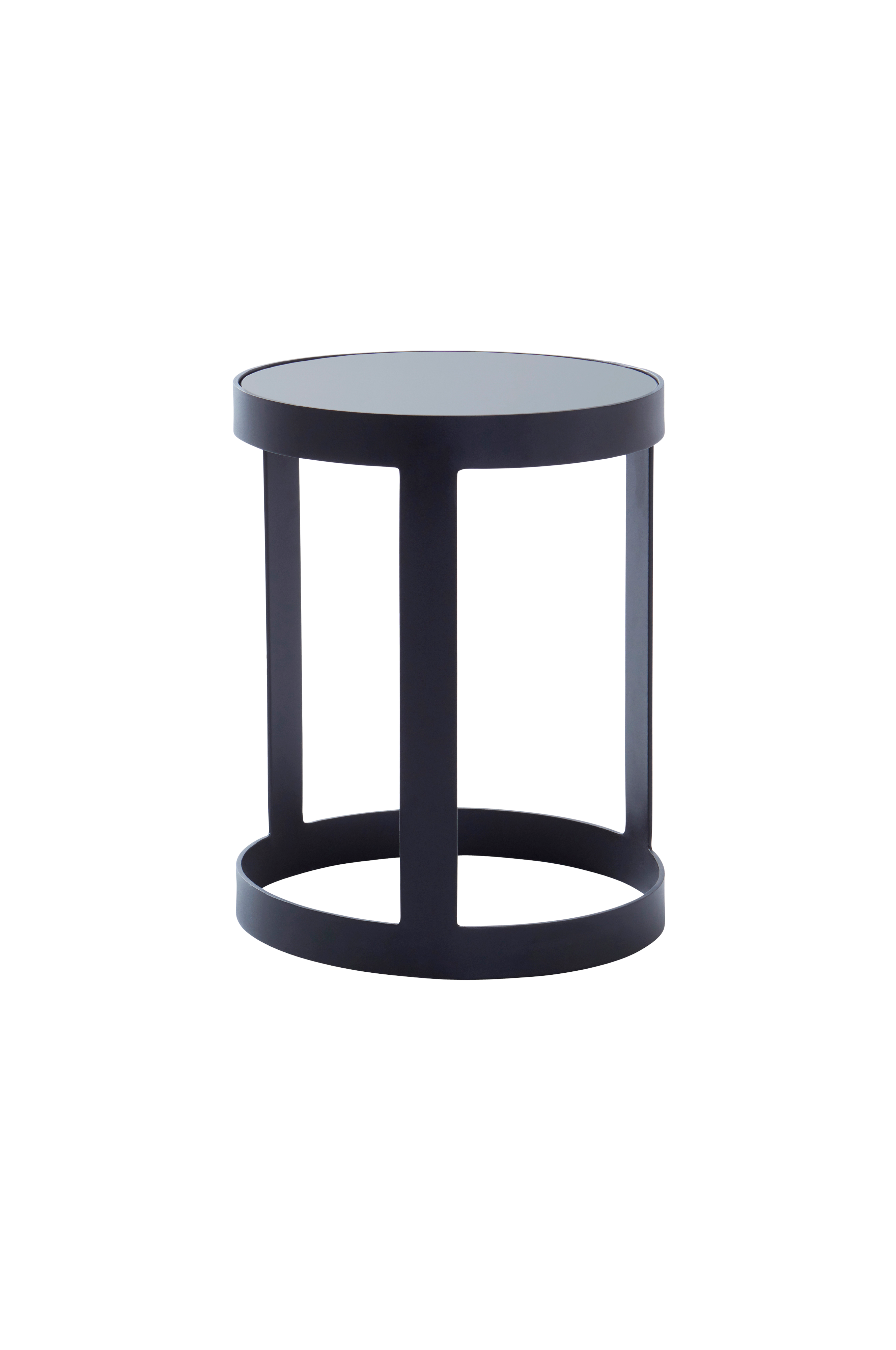 Runt, pulverlackerat metallbord med bordsskiva i rökfärgat glas. Ramen är strikt och avskalad med brodsskivan nedsänkt i ramen. Ett tidlöst bord som du kommer att njuta av länge.
