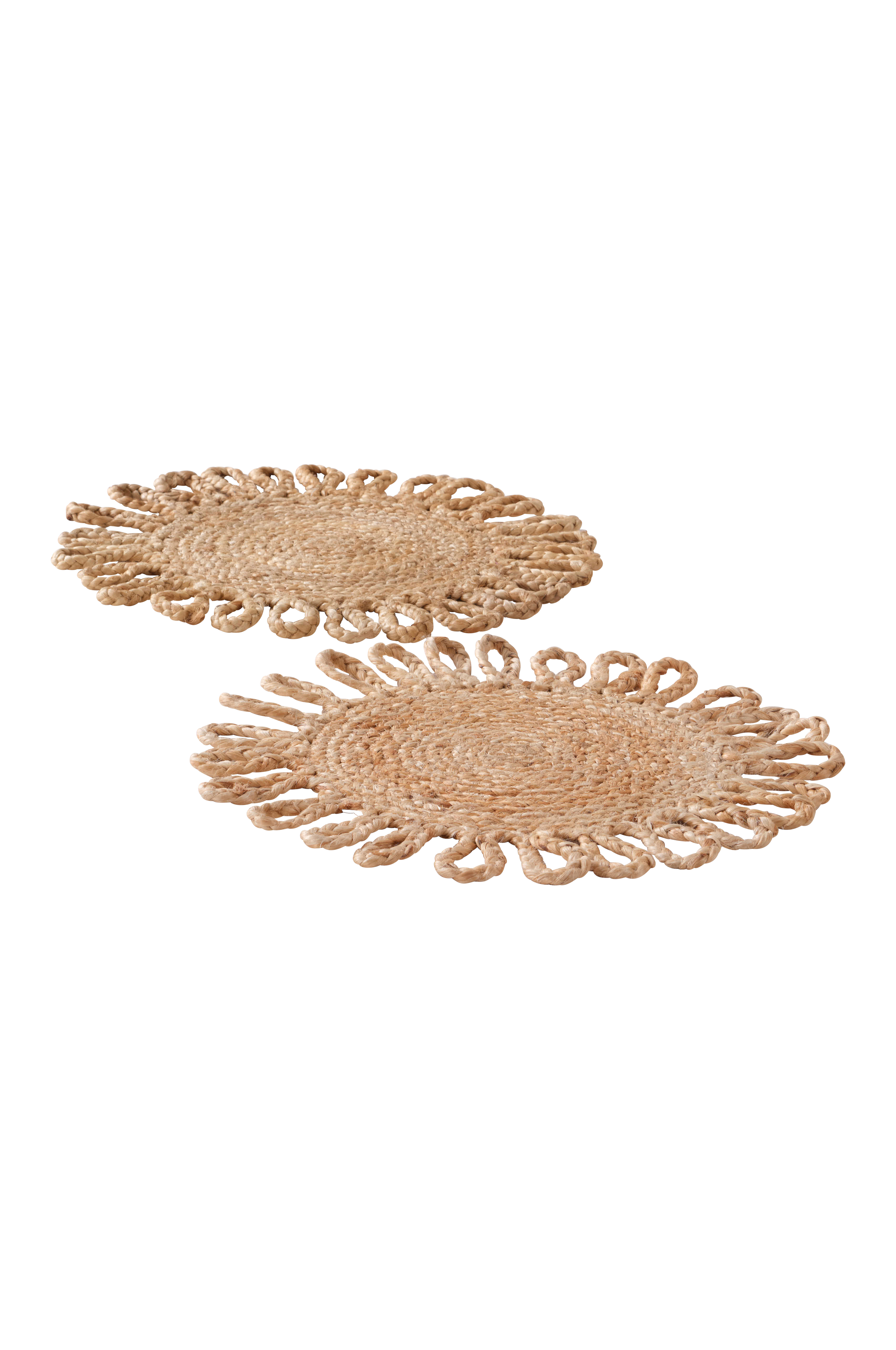 GAIA bordstabletter ger stil åt ditt matbord. Dessa runda, flätade bordstabletter är tillverkade av jute och har en naturlig charm. De säljs i ett paket om två och ger en unik, strukturerad känsla till alla dukningar.