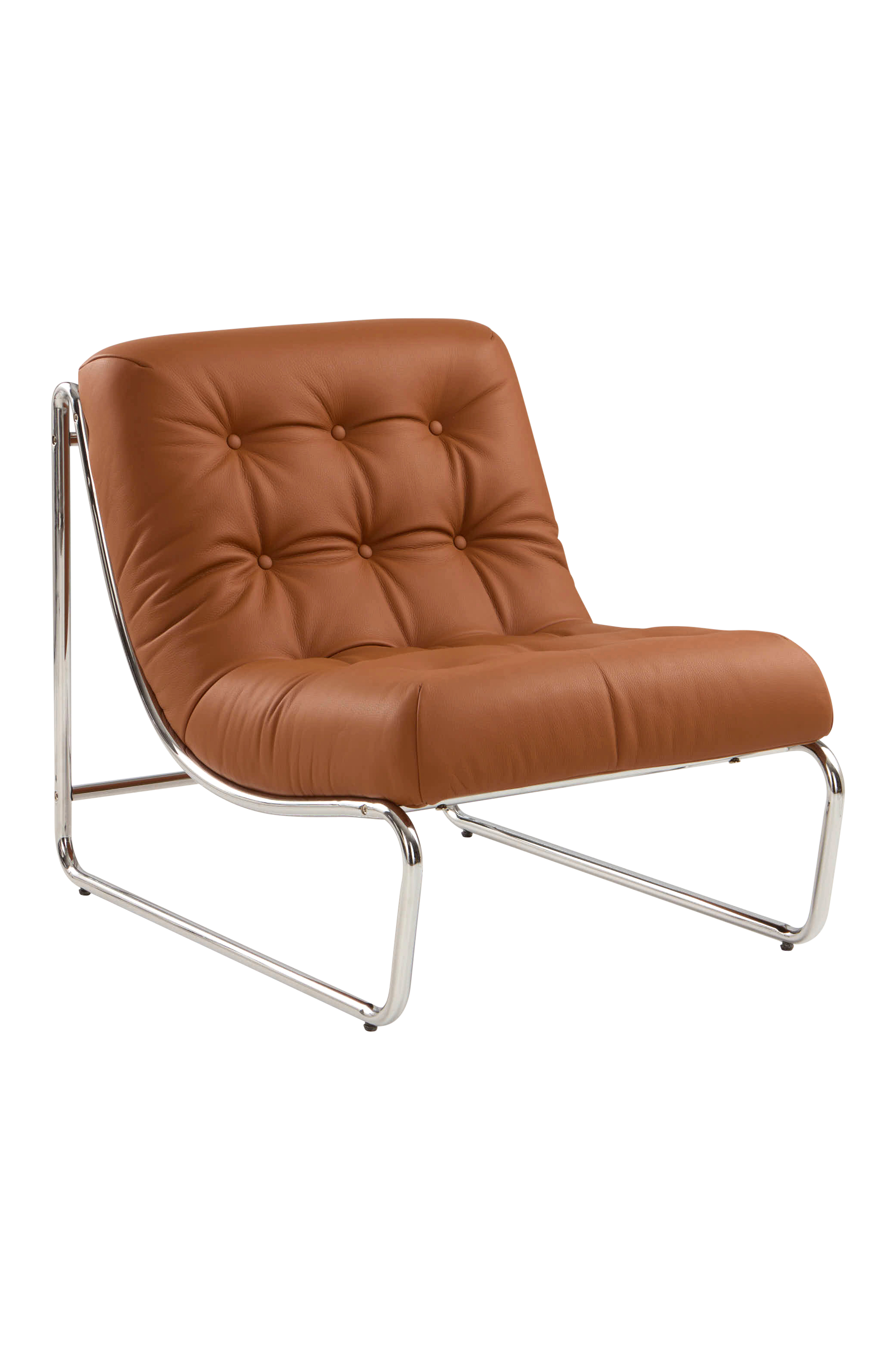 GALERIA läderfåtölj kombinerar elegant design med tidlös attraktionskraft, med kromade metallben och ett läderöverdrag för enkelt underhåll. Skumfyllning ger komfort, vilket gör den till ett elegant och praktiskt alternativ för moderna interiörer.