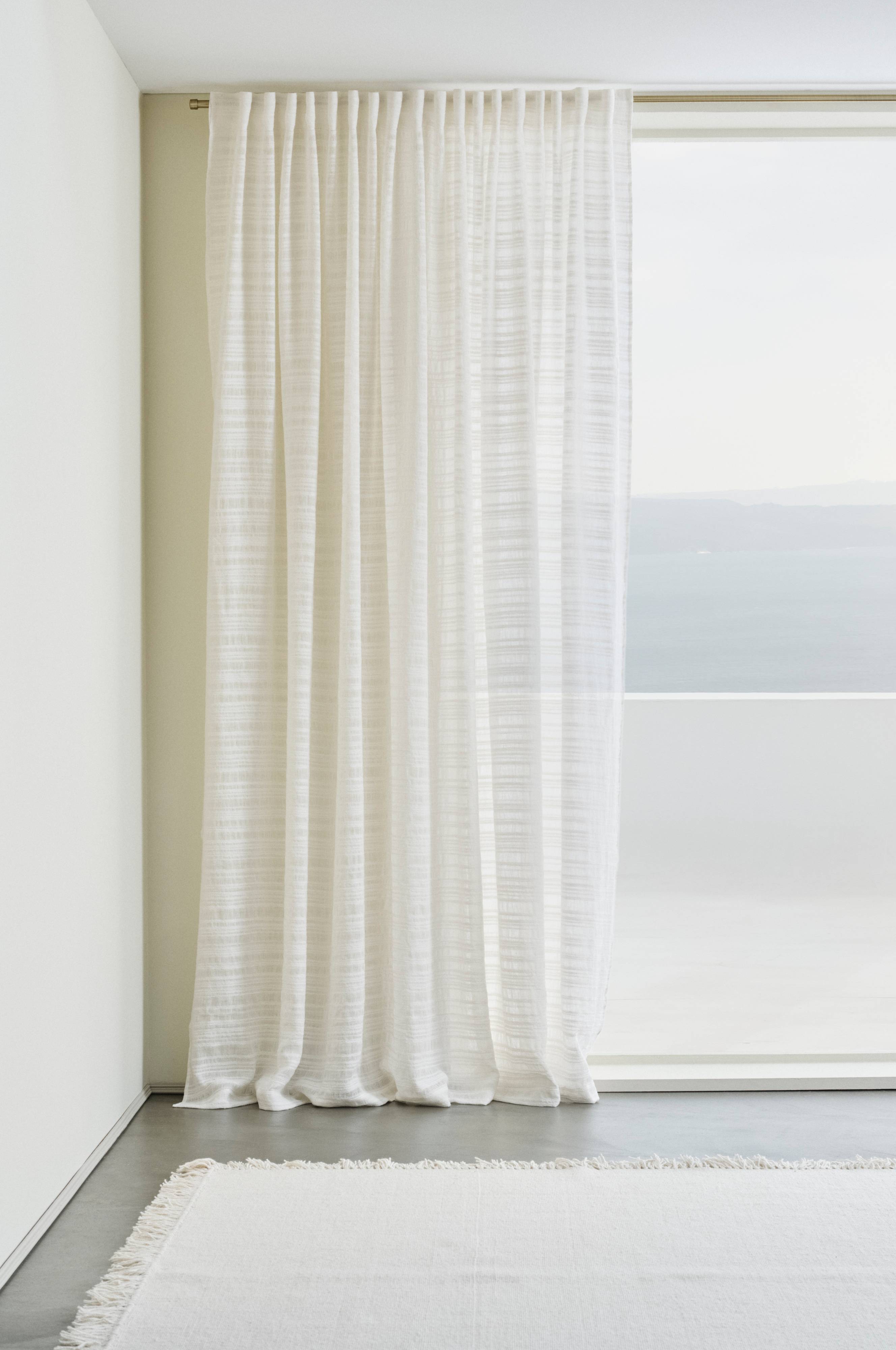 En extra bred gardinlängd i ett vackert tyg där trådar i olika tjocklek och kvalité vävts så att ett livfullt mönster skapas. Längden ger rummet en tidlös och fräsch känsla. .