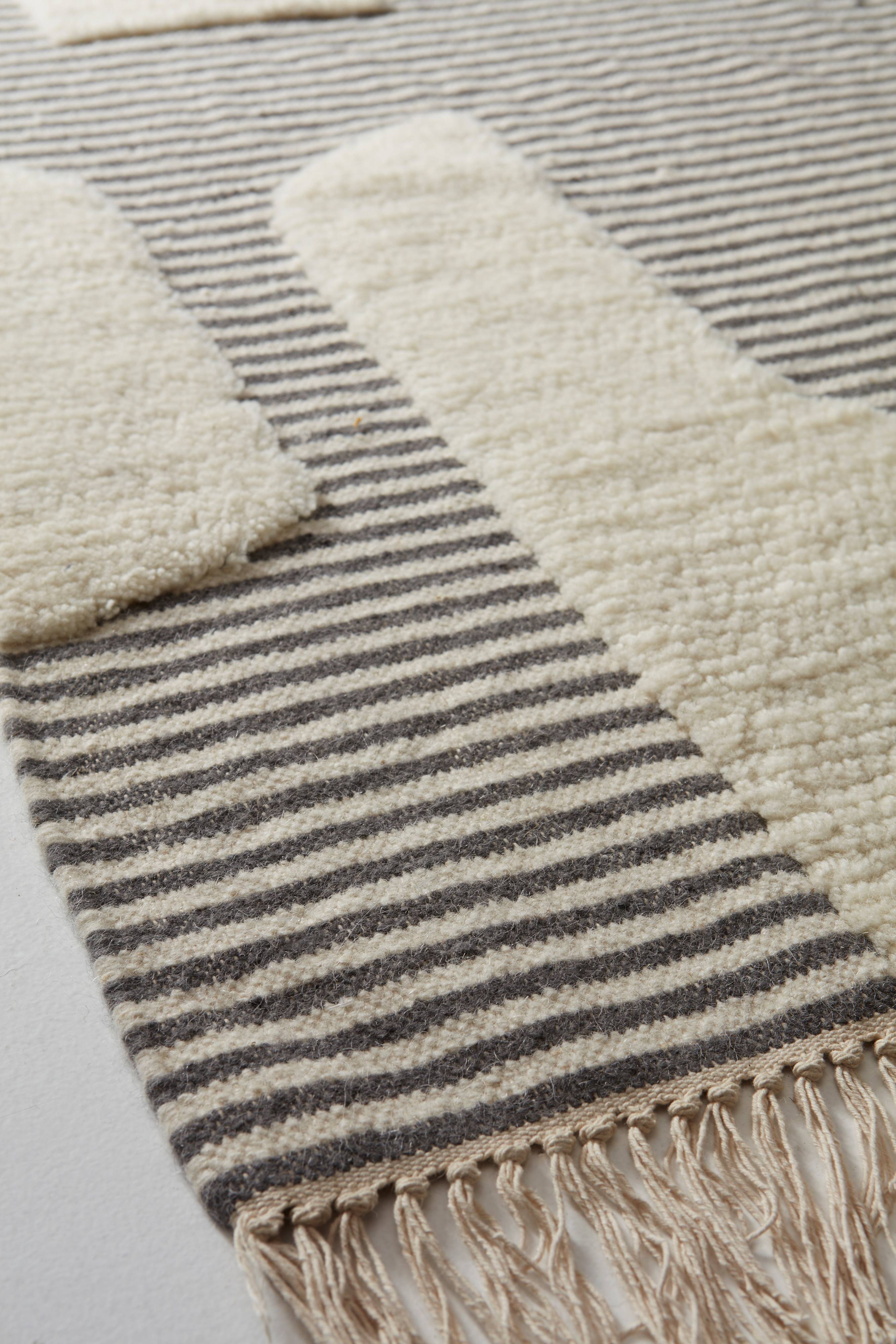 Handvävd matta av ull och bomull. HASSANE är i grunden en kelimmattan, vilket är en slätvävd matta. Vissa partier har sedan tuftats och fått en mjuk lugg. Detta gör mattana HASSANE speciell och den sticker ut från mängden med sina ljusa partier med lugg på en slätvävd, randvävd botten. Kelimmattor vävs ofta i naturliga material och HASSANE är av ull och bomull. Ull är ett praktiskt val då ullen är naturligt smutsavvisande. Mattan har fransar längs kortsidorna. Franslängd 10 cm. Lugghöjd 1,4-1,5 cm. Tjocklek 1,6-1,7 cm. 1500-1700 g/m².