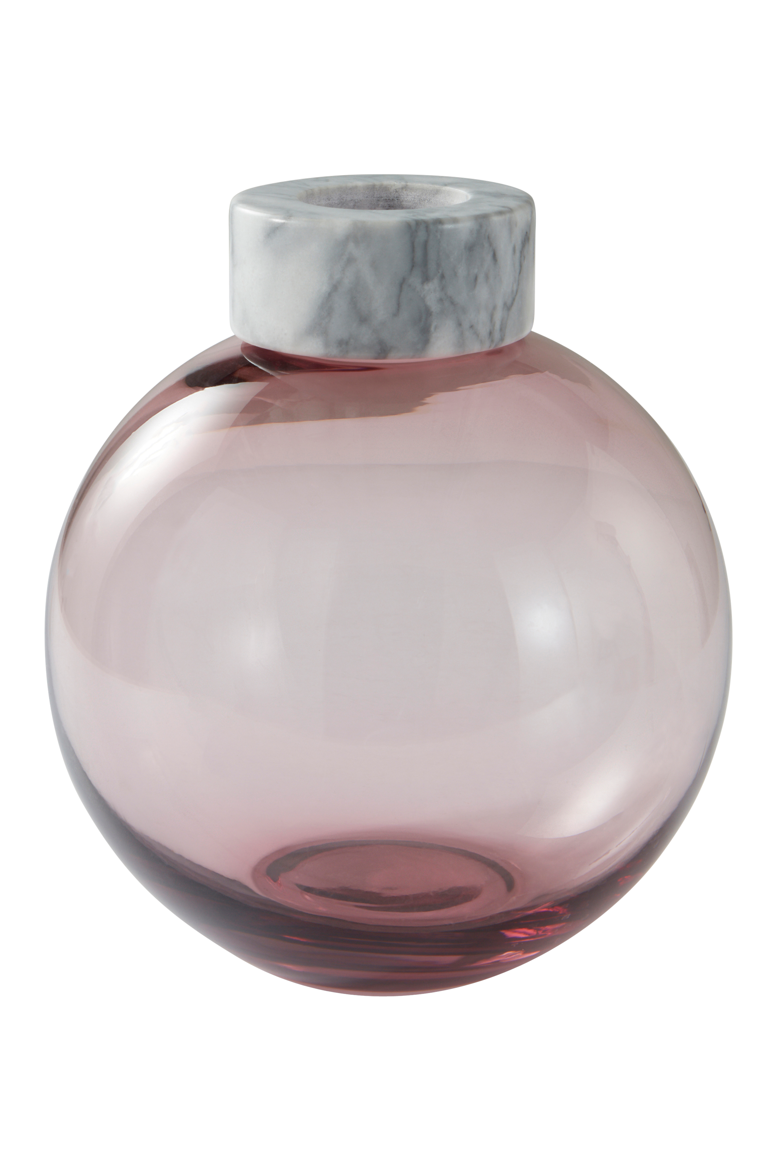 Klotrund glasvas med vacker marmorkant som extra detalj. Den smala öppningen gör det ofta lättare att få blommorna i en vacker bukett. Marmorringen upptill kan enkelt tas av.