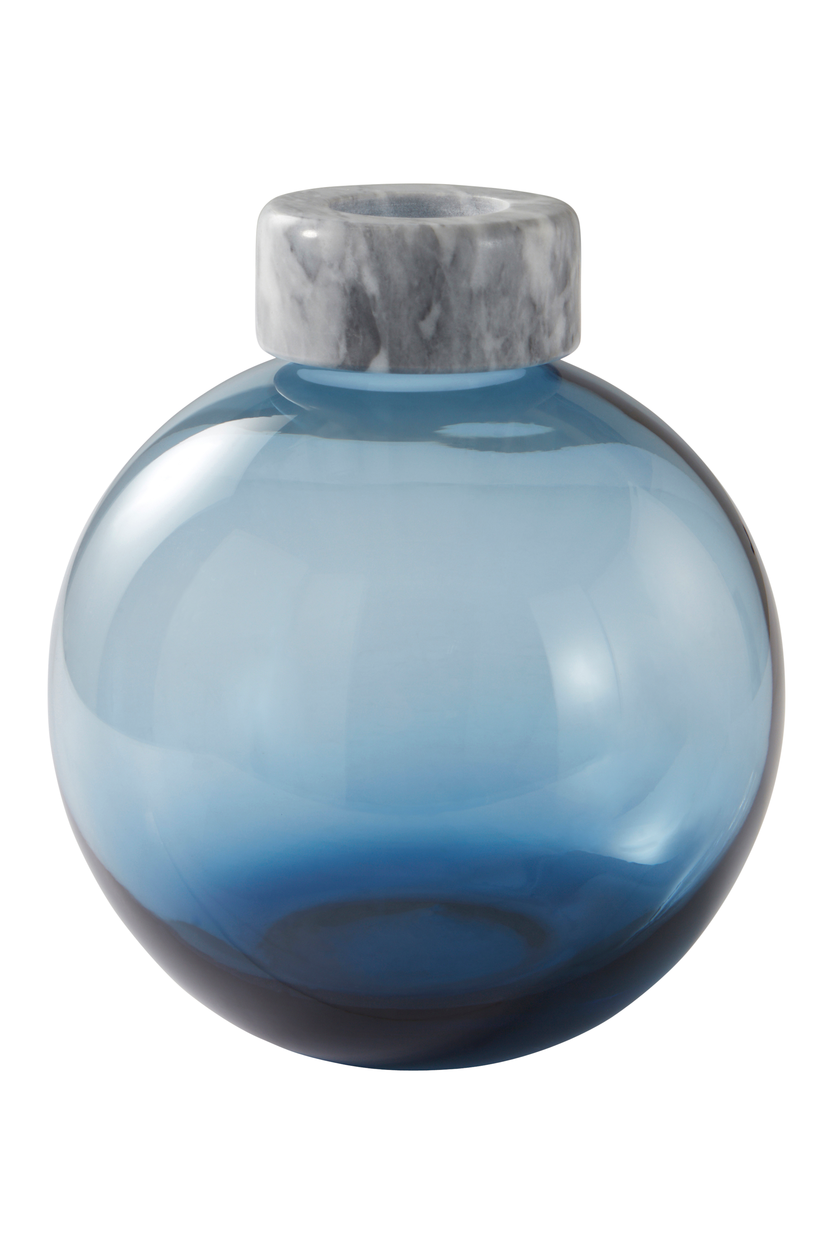 Klotrund glasvas med vacker marmorkant som extra detalj. Den smala öppningen gör det ofta lättare att få blommorna i en vacker bukett. Marmorringen upptill kan enkelt tas av.
