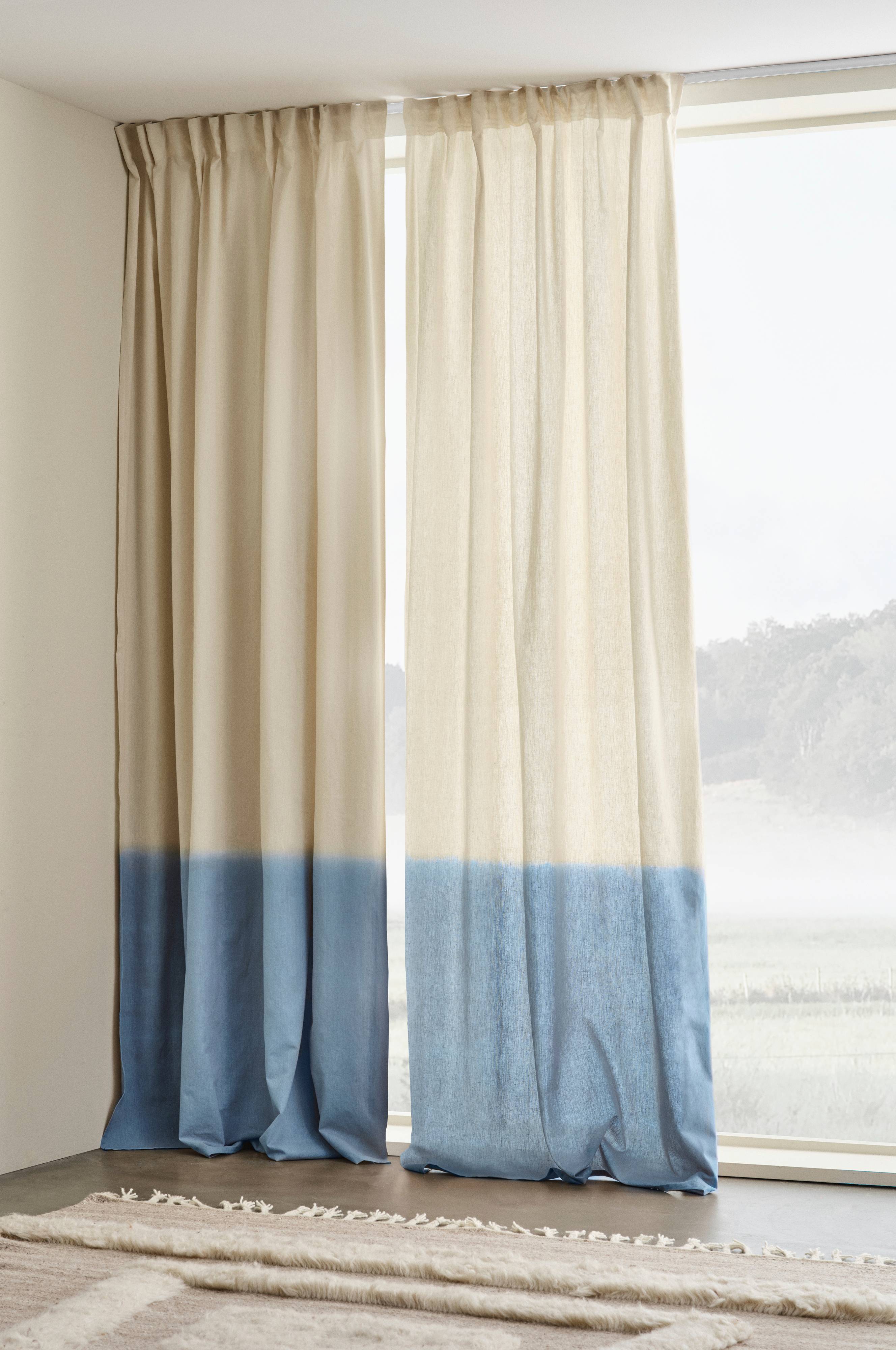Två gardinlängder av bomull och lin i fin kombination, tyget har lätt linnestruktur. Gardinlängderna är härligt färgade med avvikande nyans nedtill, den diffusa övergången ger skön batikkänsla. Längderna har påsytt multifunktionsband. Gardinen kan hängas upp med fingerkrokar, kanal samt dold hälla.