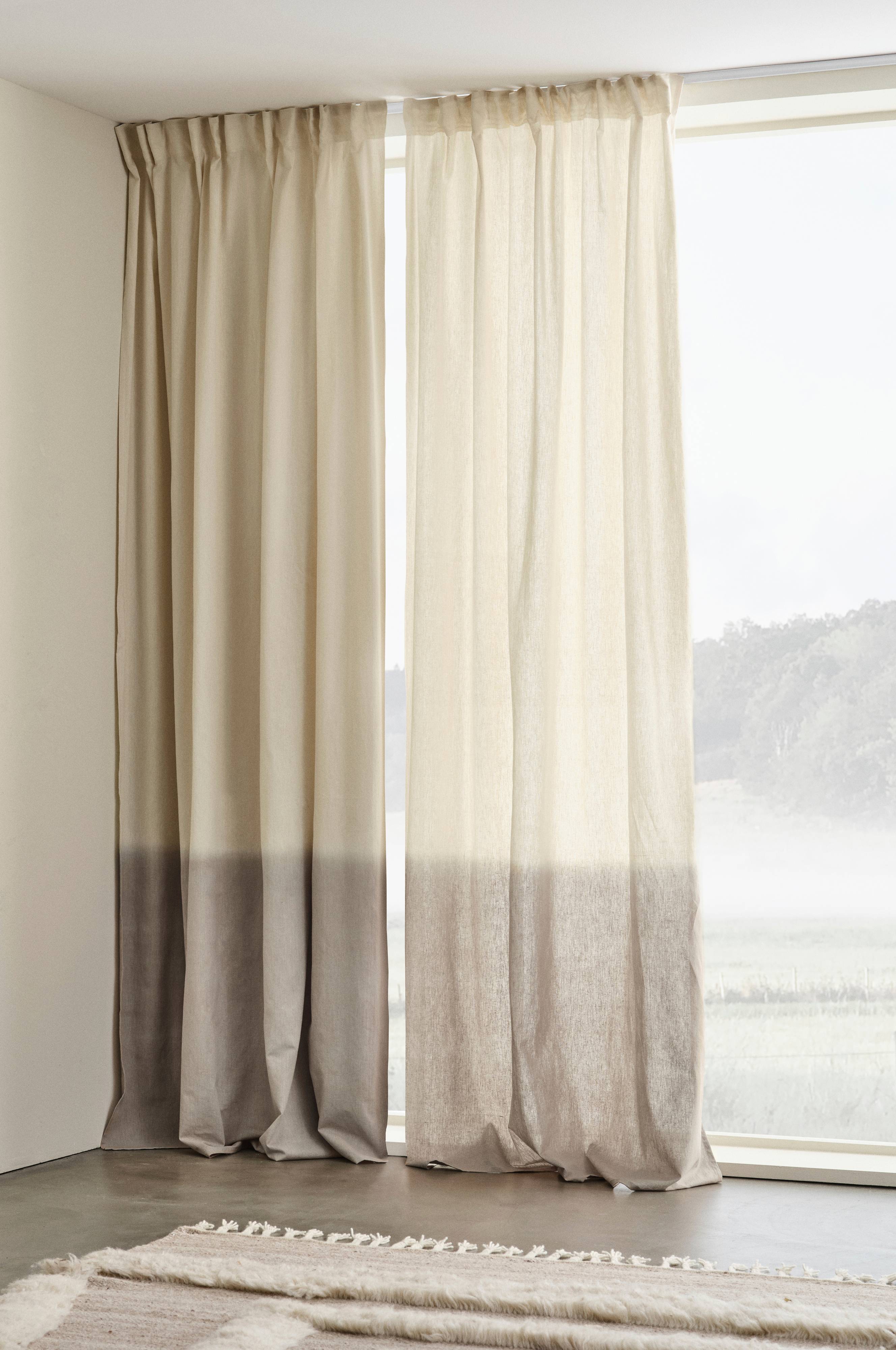 Två gardinlängder av bomull och lin i fin kombination, tyget har lätt linnestruktur. Gardinlängderna är härligt färgade med avvikande nyans nedtill, den diffusa övergången ger skön batikkänsla. Längderna har påsytt multifunktionsband. Gardinen kan hängas upp med fingerkrokar, kanal samt dold hälla.