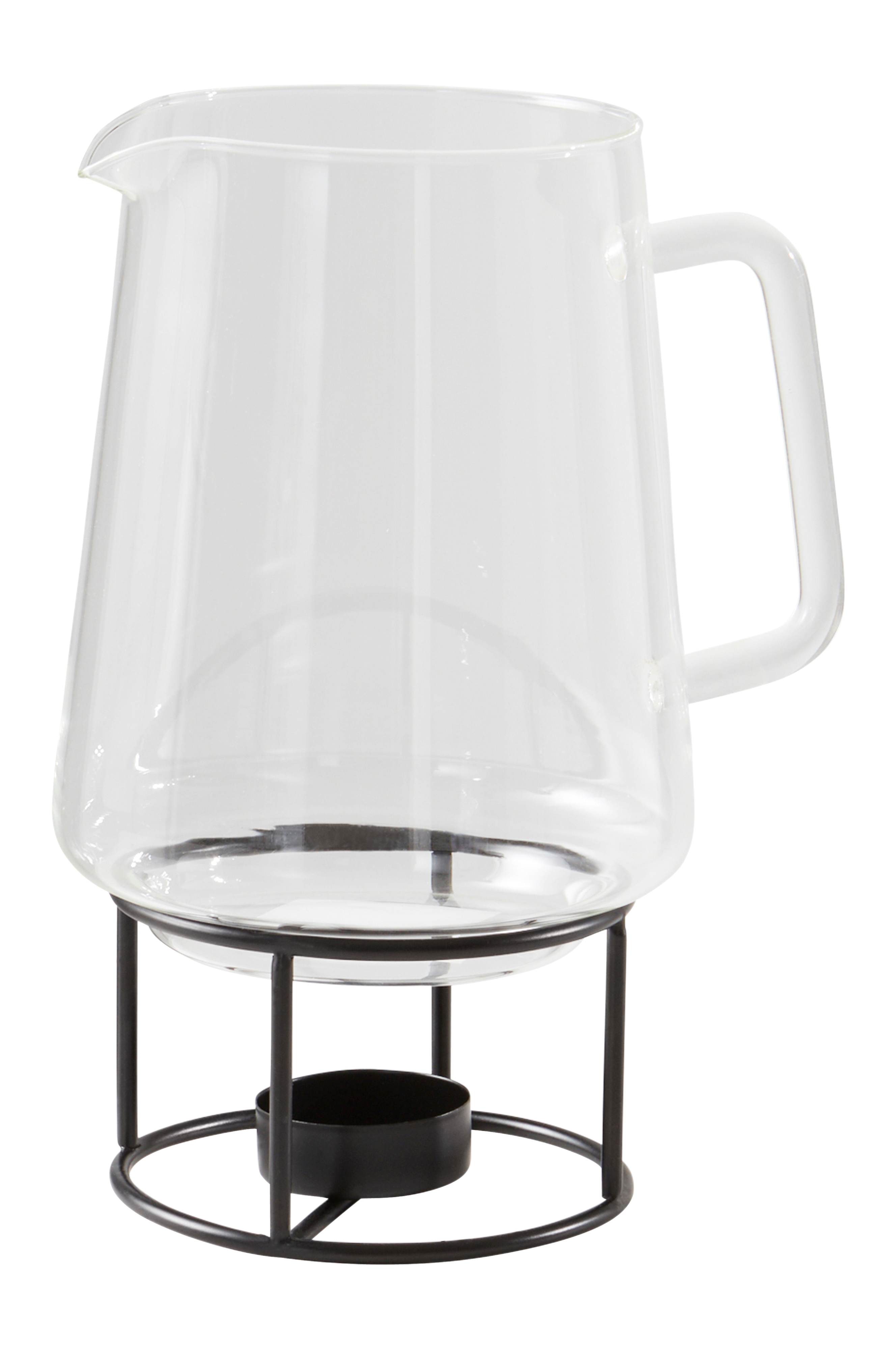 Karaff av klarglas med ställning av järn. Karaffen har lodräta ränder i glaset och ett praktiskt handtag. Ställningen har plats för värmeljus så du kan hålla drycken varm. Ställningen är svartlackerad.