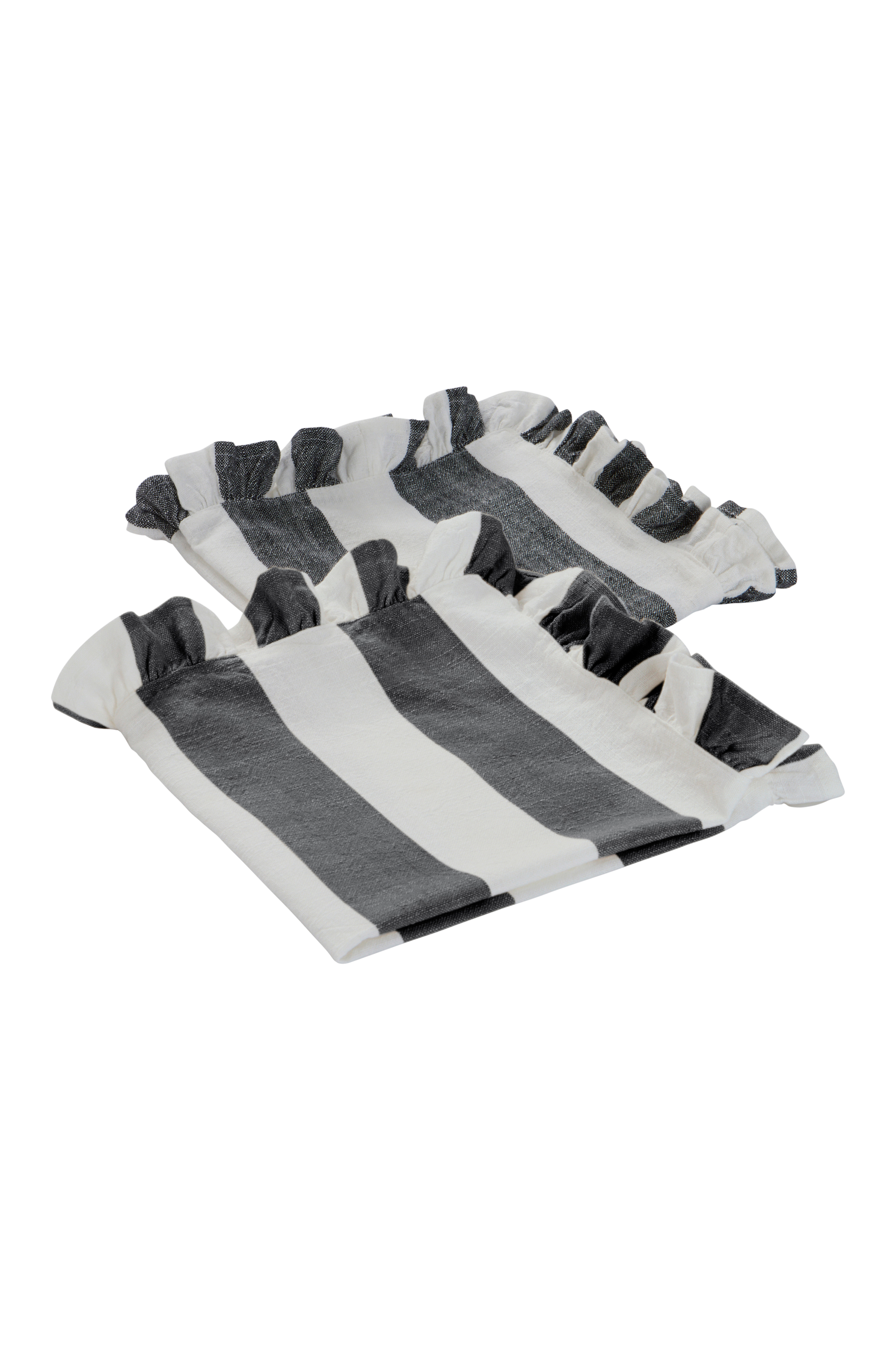 Servettuppsättningen IRIS har en elegant volang på kanterna och ett klassiskt garnfärgat randmönster som ger vintagecharm till alla bord. Servetterna är tillverkade av mjuk bomull och erbjuder en blandning av stil och komfort, perfekt för en nostalgisk middagsupplevelse.