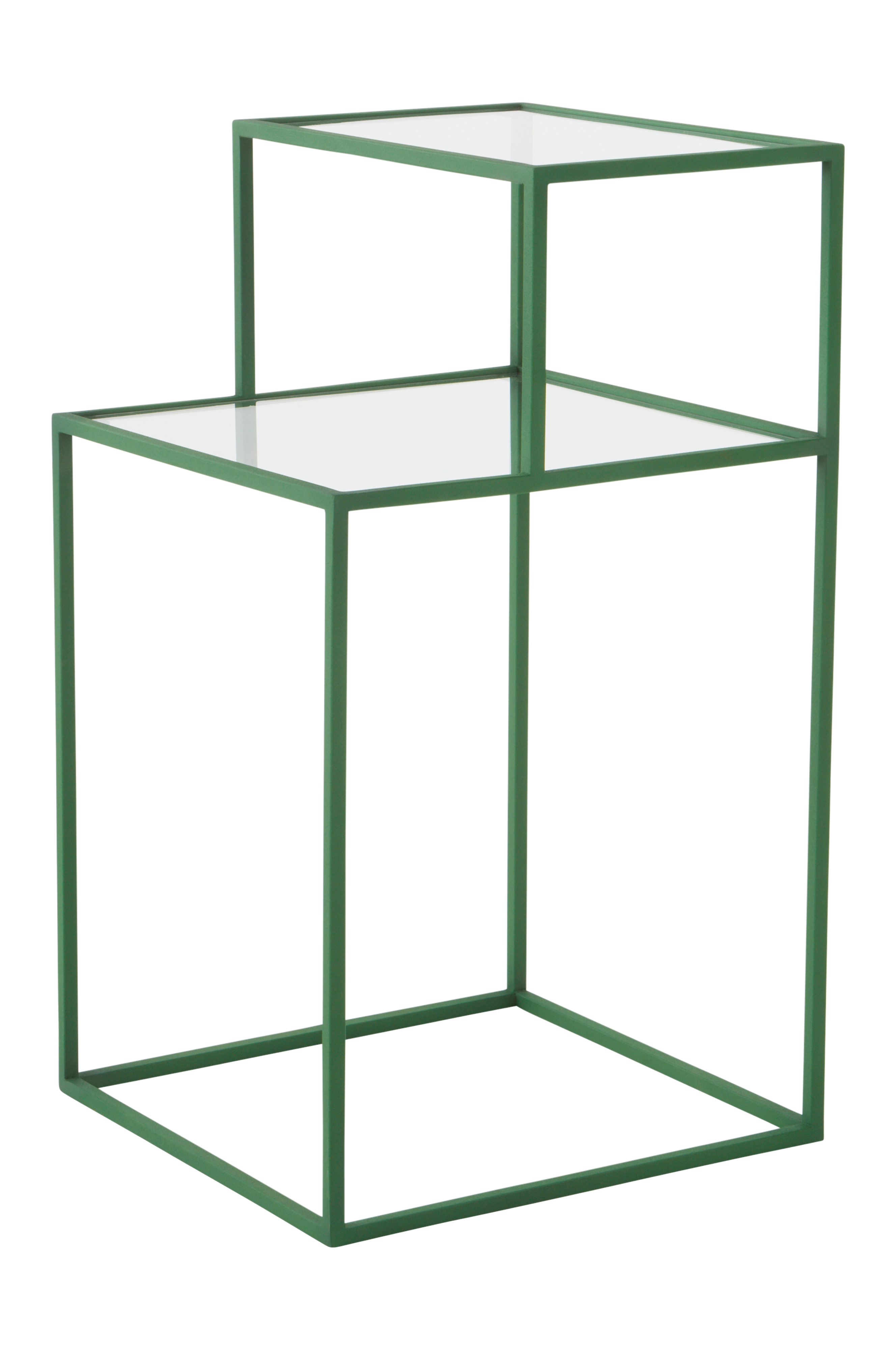 Sidobord av järn med två bordsskivor av glas som placerats på olika höjd, den ena lite större än den andra. Stommen är enfärgad och ytan har pulverlackerats med matt finish. Modellen inbjuder till många olika användningsområden och de glada färgerna piggar upp. Vill du göra ett mer stillsamt val så är det svarta bordet ett bra alternativ.