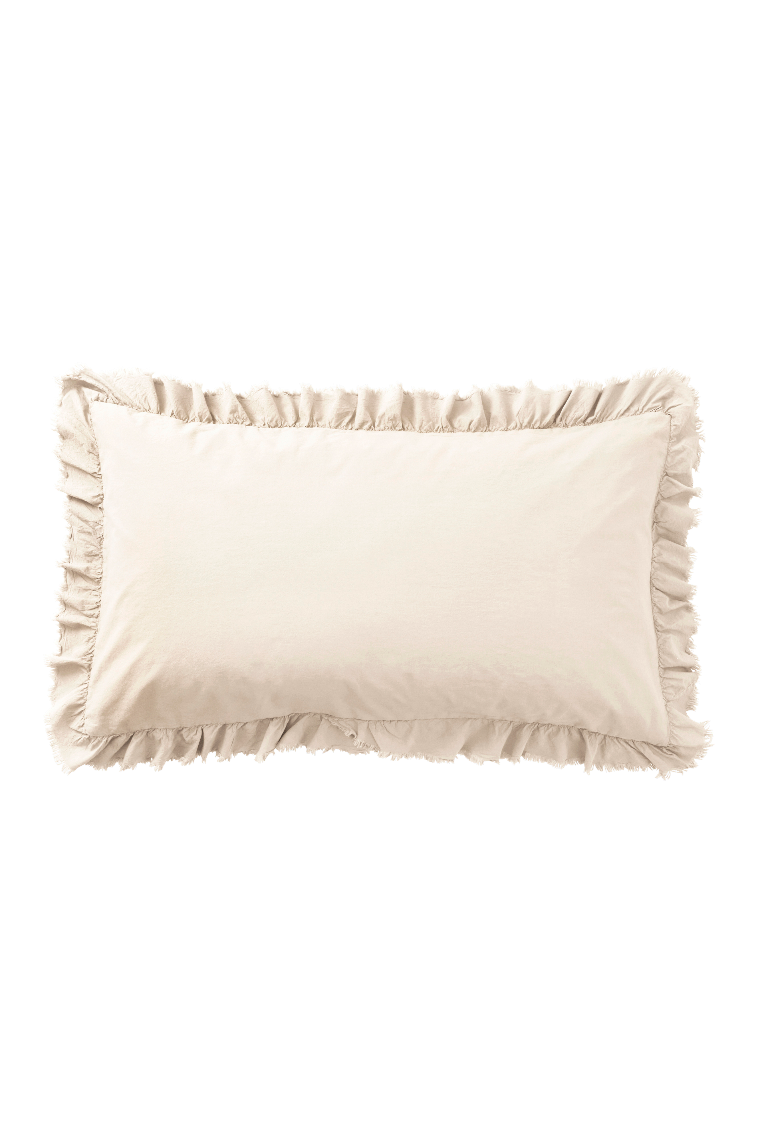 Örngott av tvättad bomull med mjuk känsla. Bomull är behagligt att bädda med och upplevs svalt och skönt mot huden. JINN har en lätt fransig volangkant runt om. Trådtäthet på 144 tc. (Trådtätheten talar om antalet trådar, thread counts, per kvadrattum i ett tyg. Ju högre trådtäthet desto högre kvalité.)