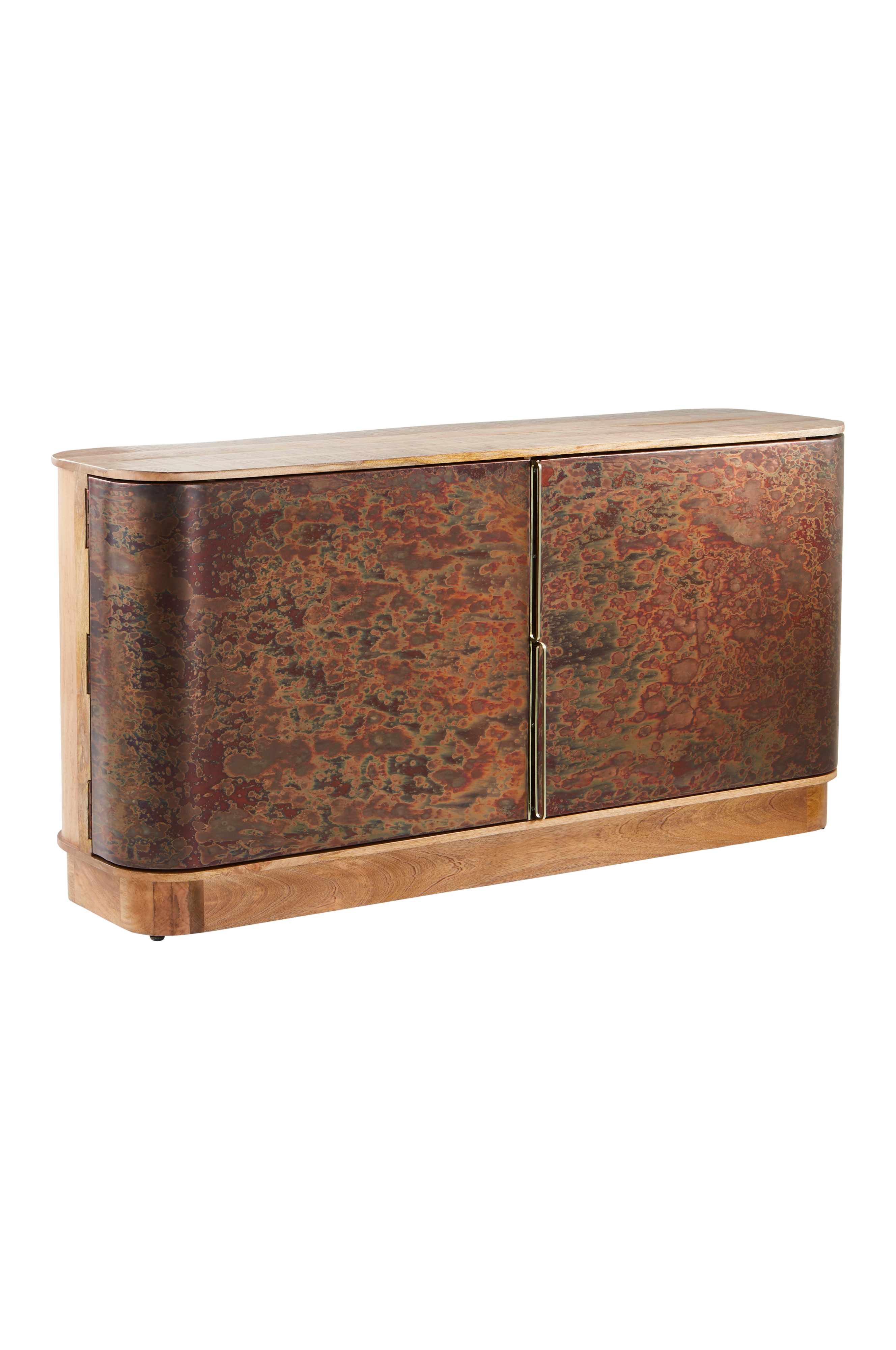 Sideboard av massiv mango med naturlig ådring och dörrar av läckert oxiderat stål. Den oxiderade ytan har unikt mönster likt olja i vatten och de båda dörrarna har effektfulla handtag av mässing. Det i kombination med fint mangoträ gör JORO till en möbel som sticker ut, det är inte en i mängden. Dörrarna är lätta och de hålls stängda med magnetlås. Bakom dörrarna döljer sig ett fast hyllplan på mitten, hyllan är indelad i två större fack mitt fram och två rundade småhyllor på vardera ytterkanten. Här förvarar du perfekt allt från glas till dukar och mediaenheter. JORO är en praktisk möbel som tar plats och ger rummet karaktär.