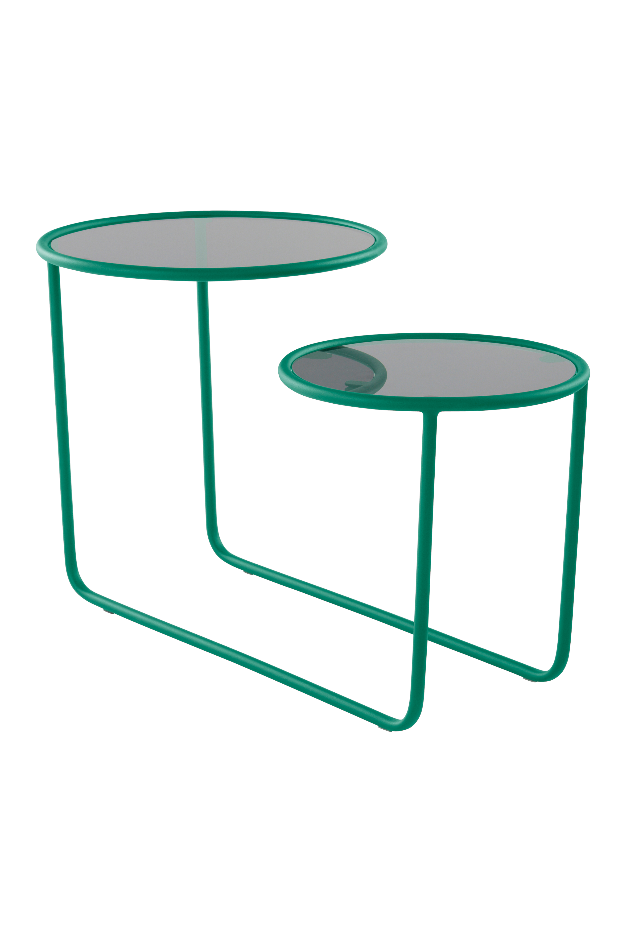 KALLO är ett dubbelt sidobord i spännande design. De runda bordsskivorna är av rökfärgat glas och stommen är av järnrör som pulverlackerats. Bordet kommer alltid att vara på samma plats i förhållande till varandra och sidobordet kan fungera bra som soffbord vid en mindre soffa.