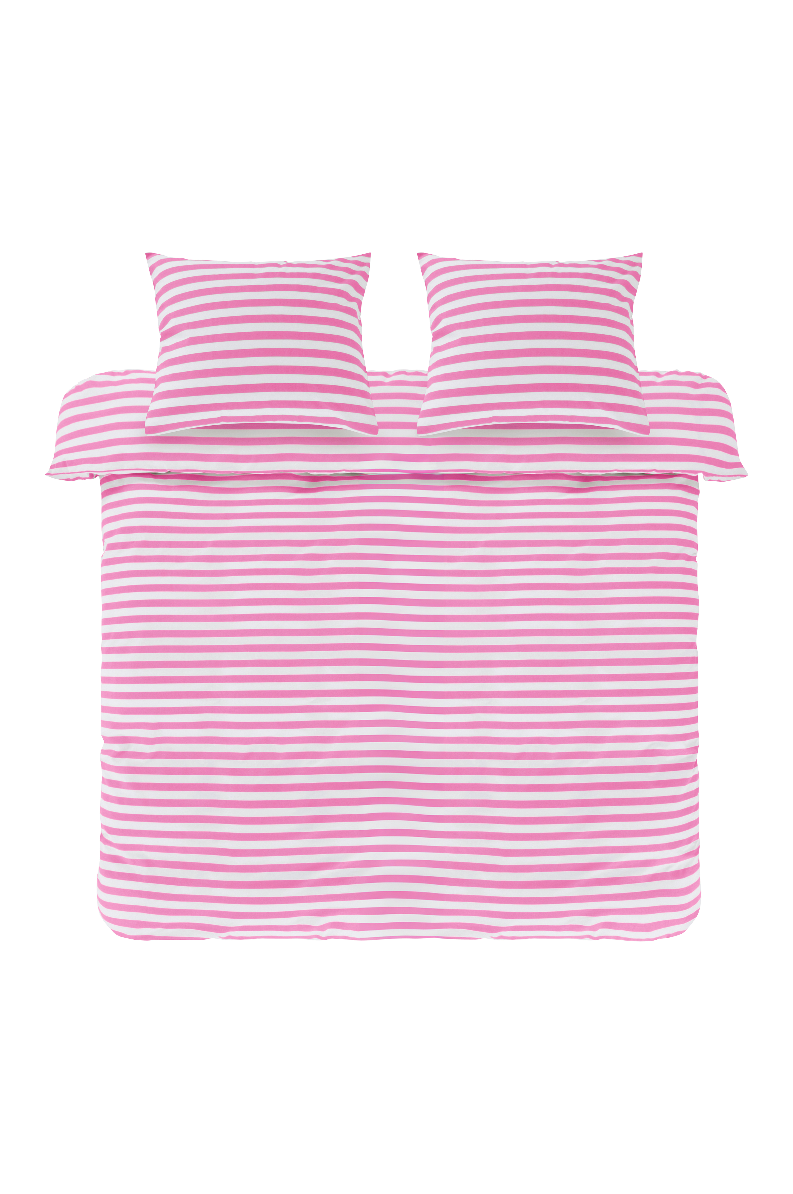 Randigt påslakanset i tre delar, ett extra brett påslakan och två örngott av bomull. Den tvärgående randningen är tryckt i fräscha, somriga färger och på båda sidor av örngott och påslakan. Bomull är en mjuk och behaglig kvalité som känns sval mot huden.