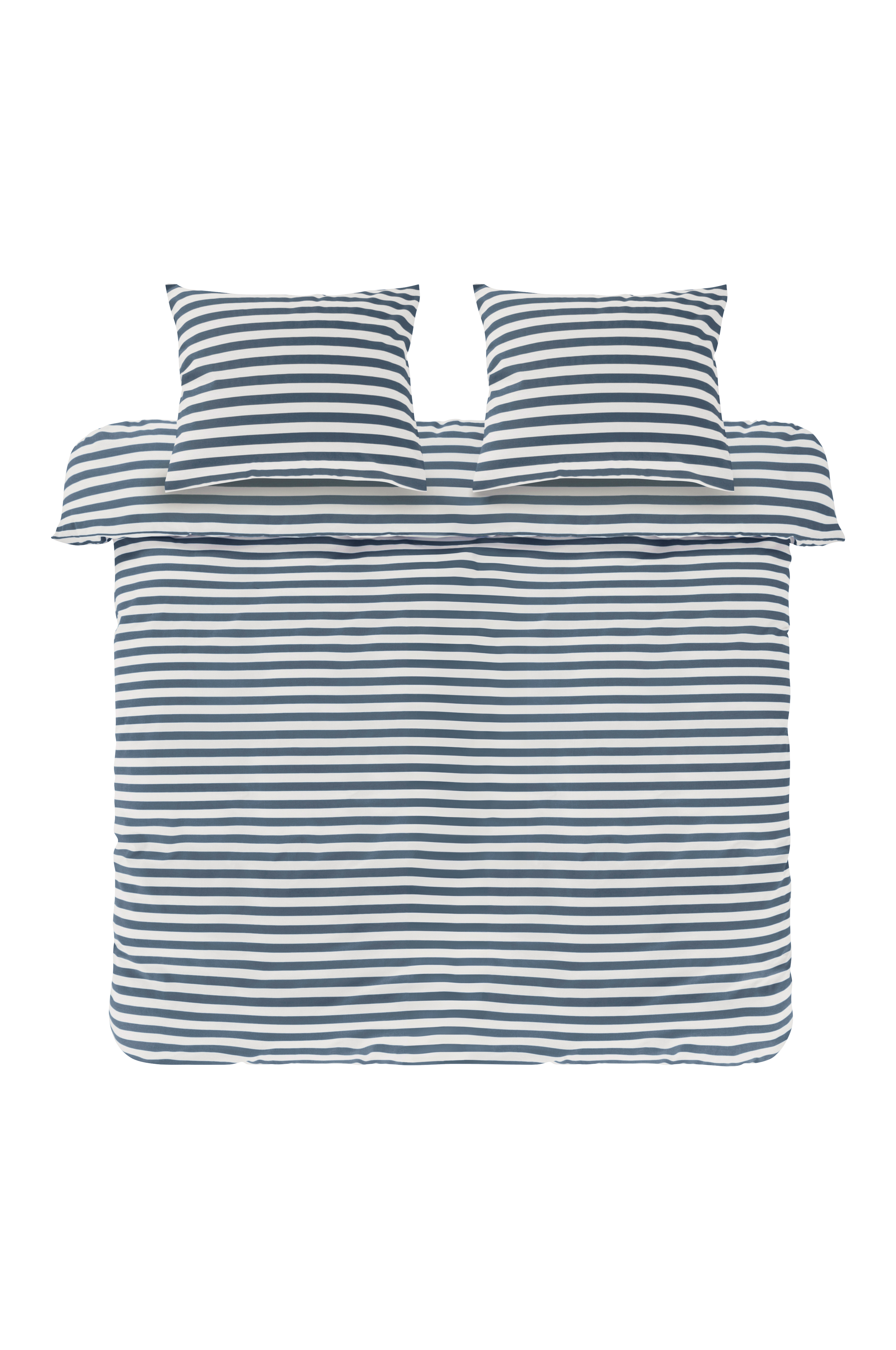 Randigt påslakanset i tre delar, ett extra brett påslakan och två örngott av bomull. Den tvärgående randningen är tryckt i fräscha, somriga färger och på båda sidor av örngott och påslakan. Bomull är en mjuk och behaglig kvalité som känns sval mot huden.
