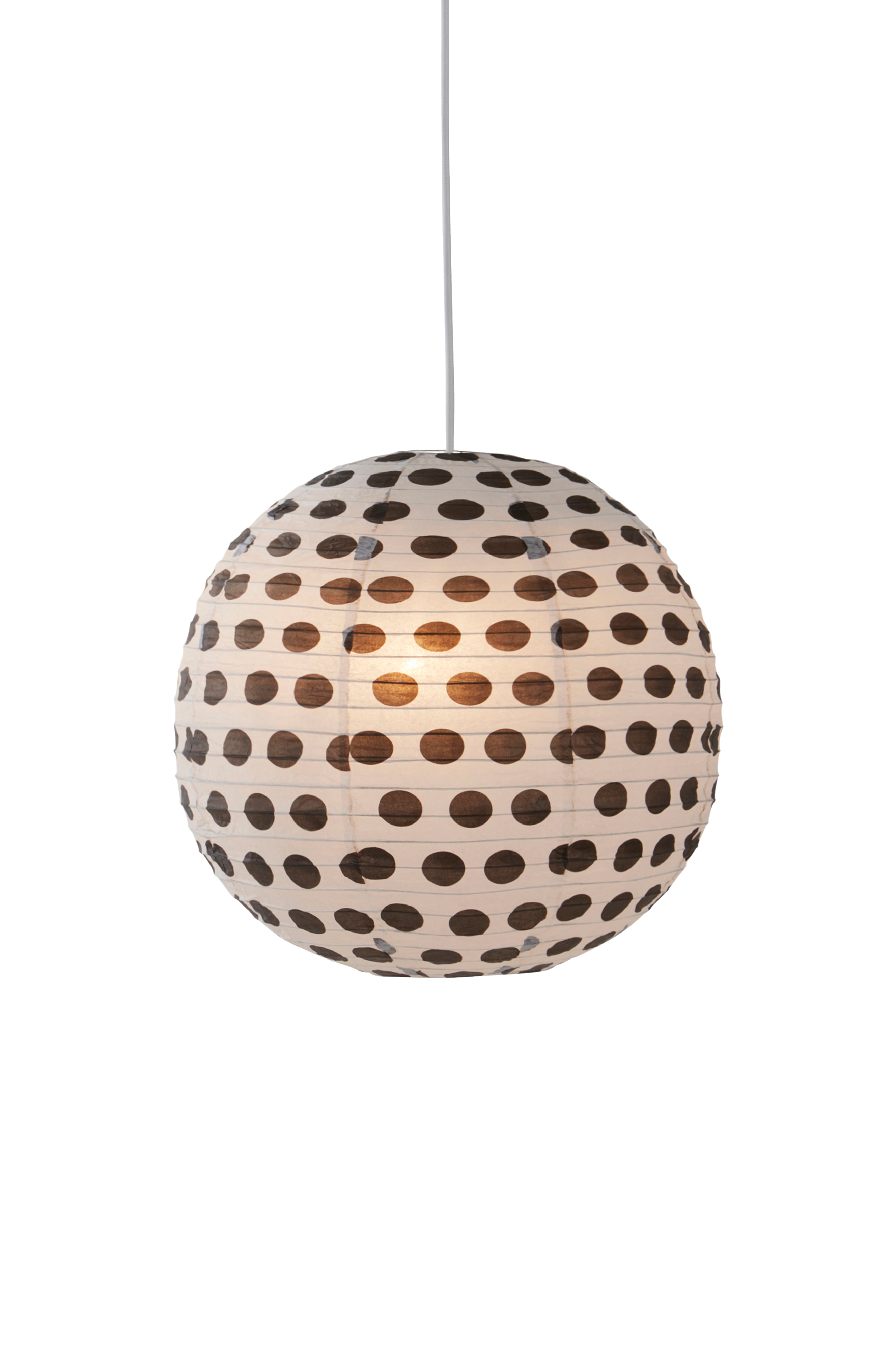 Taklampa med prickig skärm av rispapper som sprider ett mysigt sken när lampan lyser. Vit sladd, sladdlängd 1,2 m. Lampan är jordad, klass 1. På grund av EU-regler behövs en separat takkontakt i vissa länder. Takkontakten ska vara jordad (klass 1) och köps separat.