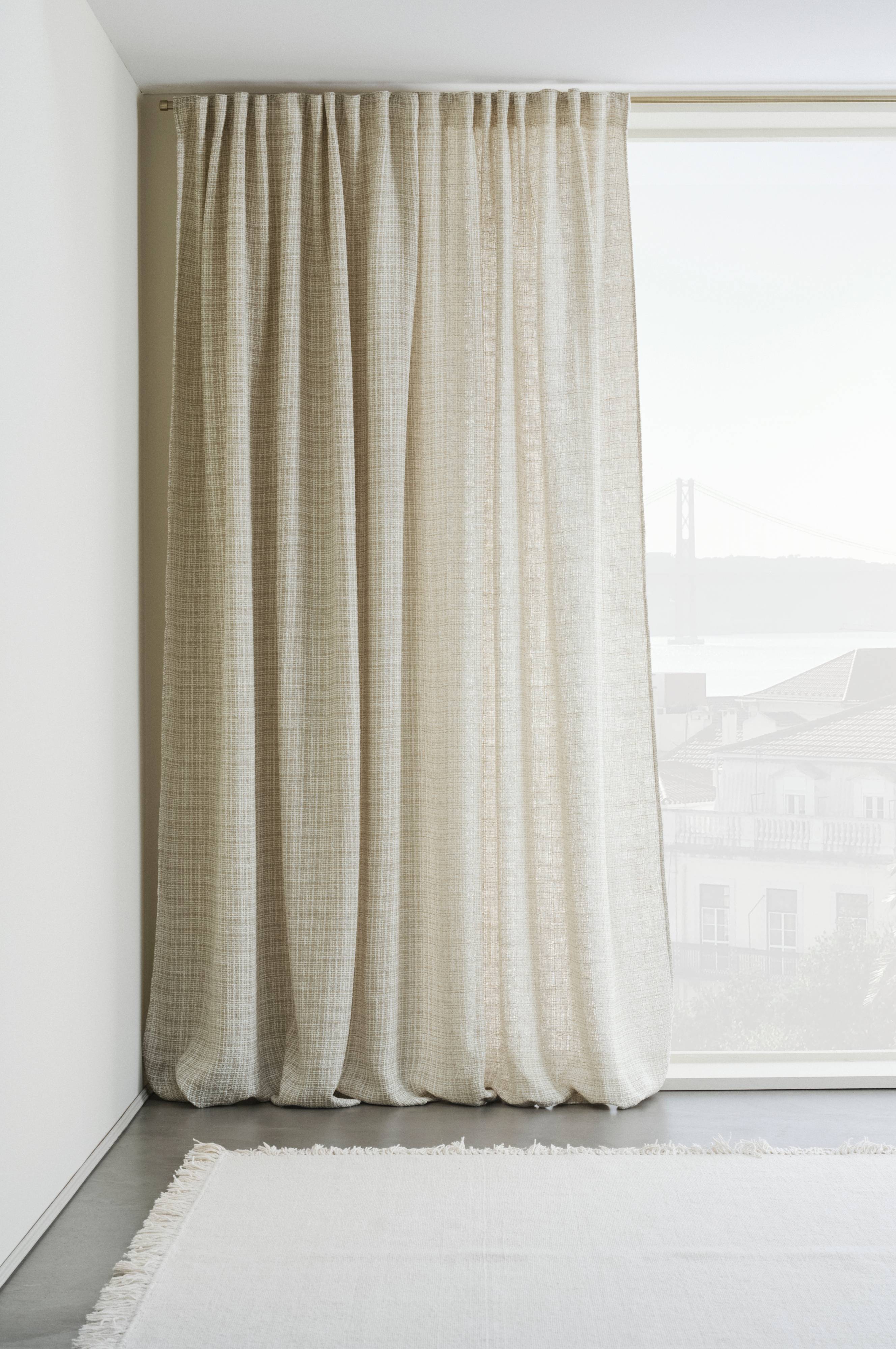 En extra bred gardinlängd i ett vackert tyg där olika trådar vävts till ett livfullt mönster. Det oregelbundna rutmönstret upplevs melerat på håll och gardinen har tyngd och faller fint. KIM har påsytt multifunktionsband och gardinen kan hängas upp med fingerkrokar, kanal samt dold hälla. Tygets gramvikt 260 g/m²