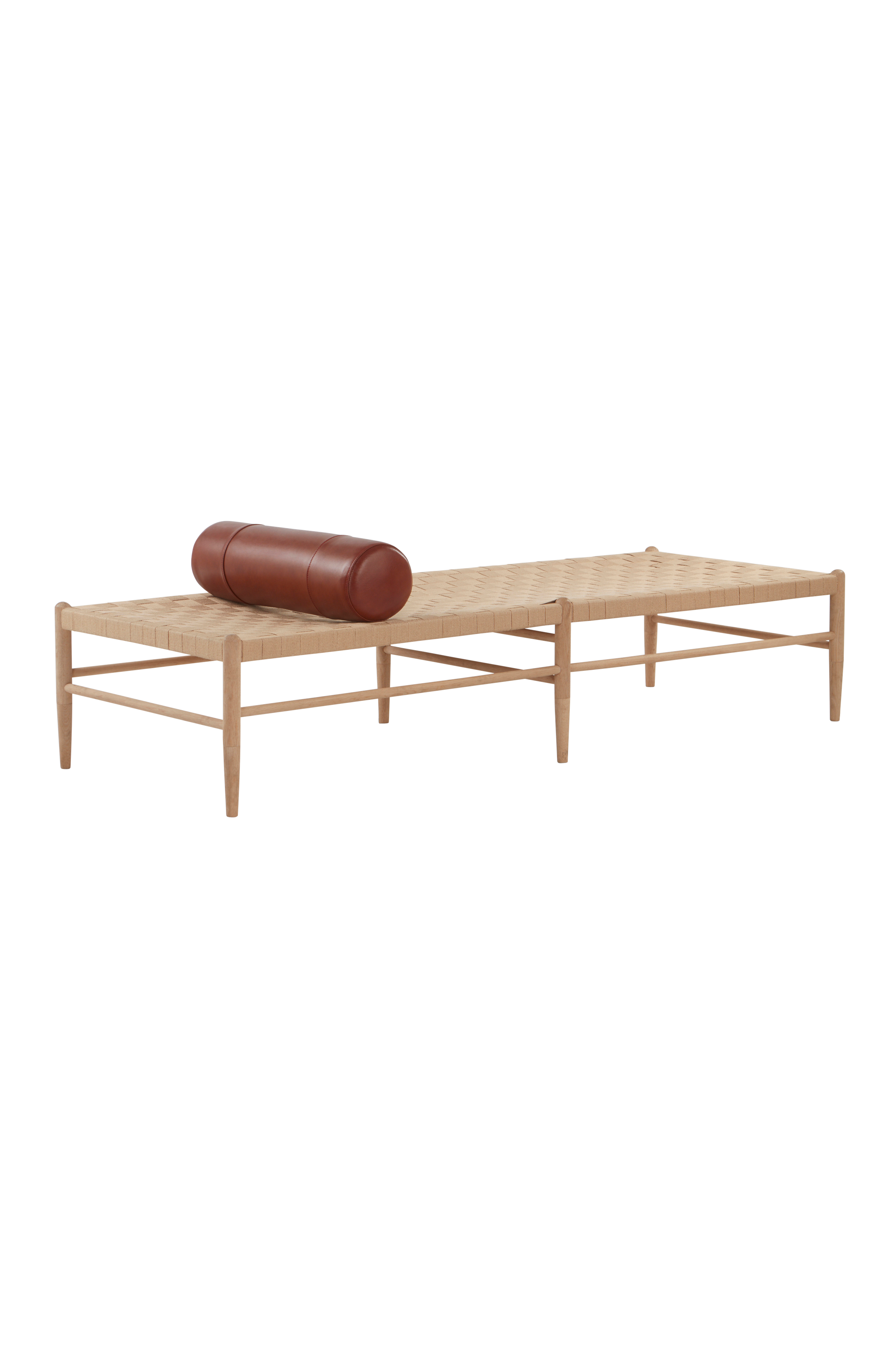 KÖPENHAMN dagbädd ger med sina rena linjer, flätade sadelgjord och lyxiga cylinderformade läderkudde ett extraordinärt intryck som lyser upp vilket rum som helst. Dagbäddens sadelgjord är tillverkad i flätad jute och har ett stilrent underrede av vitsåpad ek.