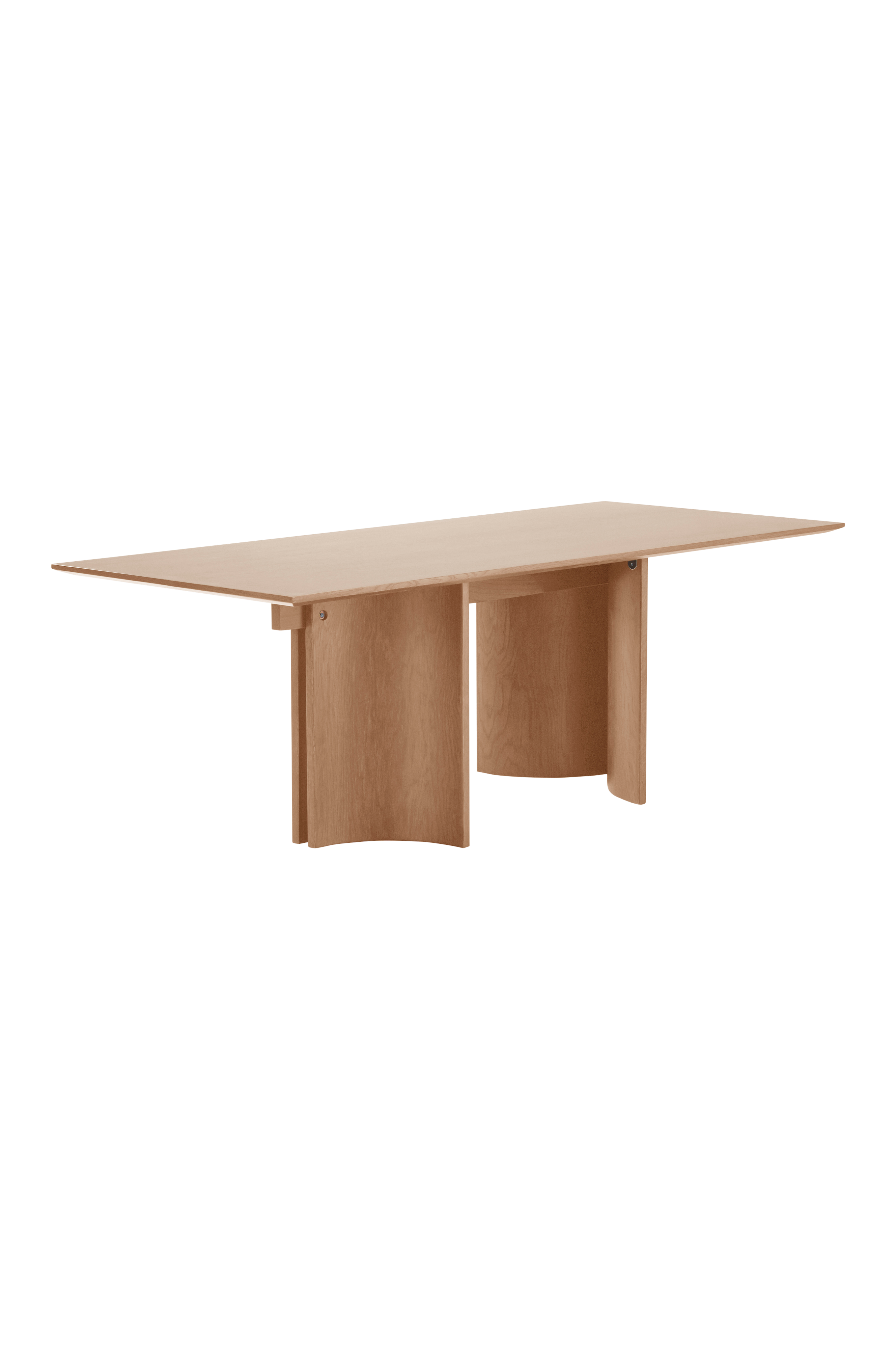 Det rektangulära bordet är tillverkat av ek med bordsskiva av MDF med ekfaner. Underredet har strukits med vattenbaserad lack så att träets ådring bibehålls och ger ett vackert mönster. Bordskivan är behandlad med polyuretanlackfärg. De rundade benen ger en öppen, rymlig känsla och samtidigt generöst utrymme för benen. Viss montering krävs. Monteringsanvisning medföljer.
