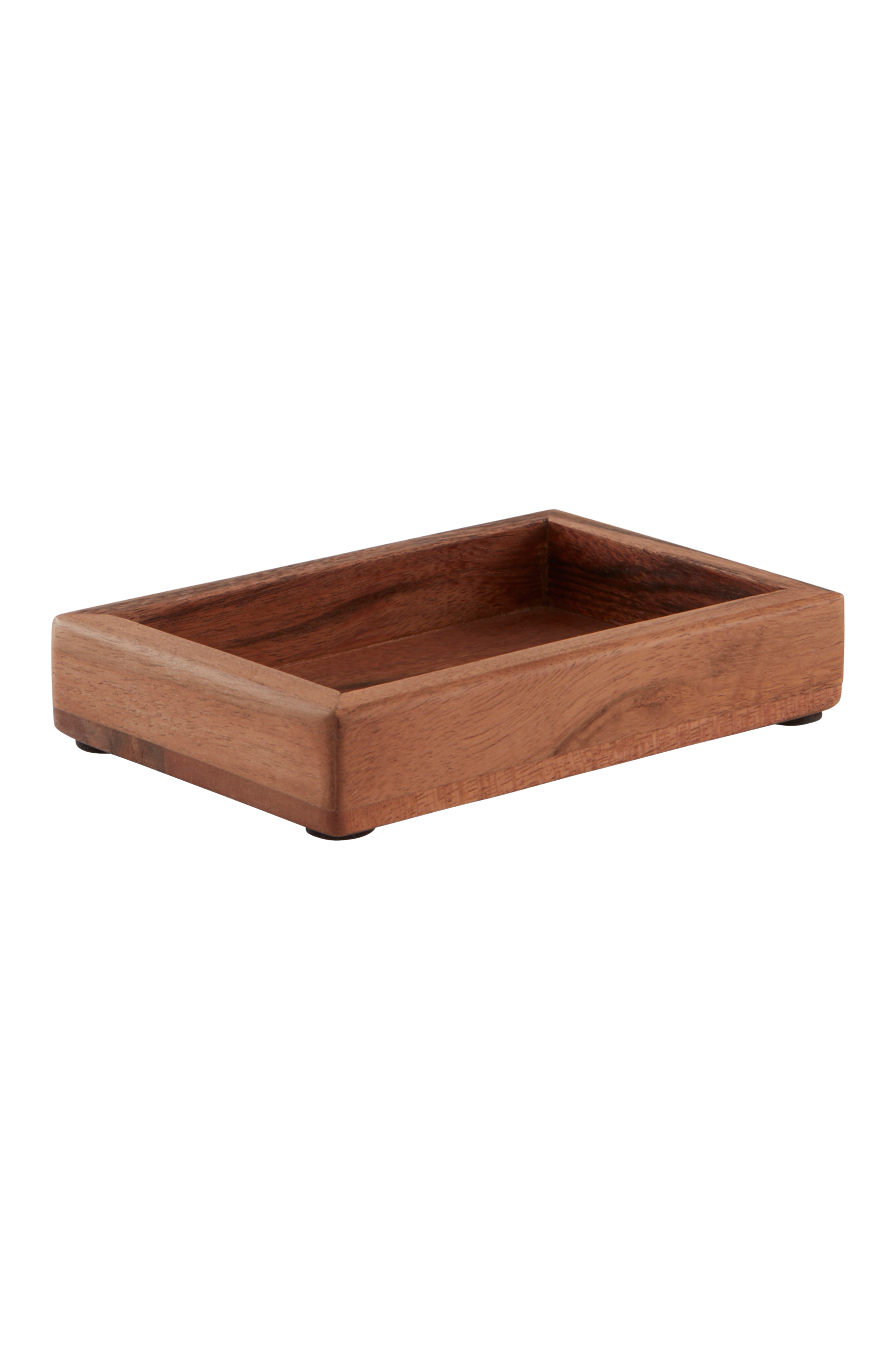 Fyrkantig tvålkopp av mangoträ med vacker ådring och djup, fin träfärg. Fatet har en liten kant runt om och passar perfekt för småsaker i badrummet. Badrumsserien KYOKO finns i flera delar som ger badrummet en varm och stilfull känsla.