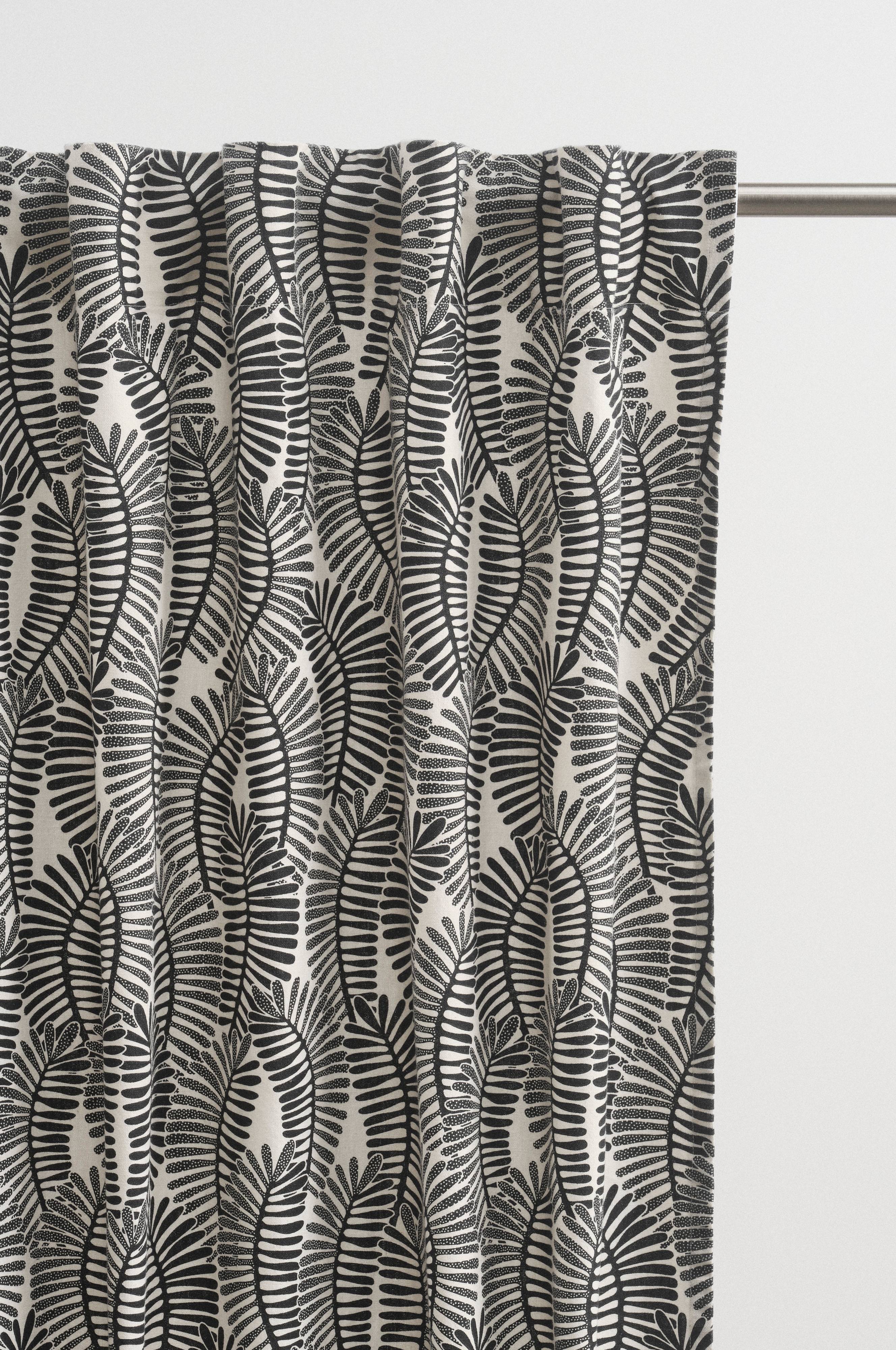 LEAVES-gardinen har en design av ormbunksblad som ger en naturlig touch till ditt rum. Den är tillverkad av en mjuk bomulls- och linblandning som ger komfort och elegans. Varje förpackning innehåller två längder.