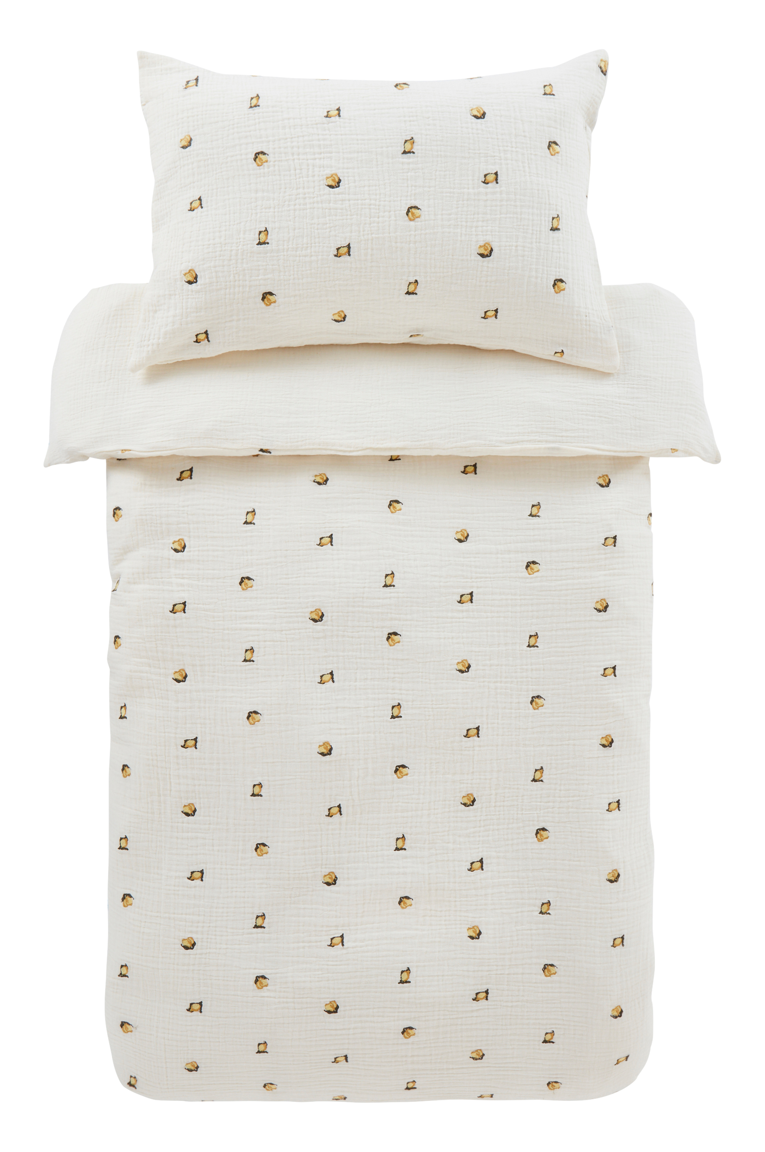 Påslakanset i 2 delar i härlig, ekologisk bomullsmuslin med broderade små citroner. Setet passar till spjälsäng. Muslin är ett mjukt, tunt tyg i två lager, vävt med bubblig effekt, vilket gör tyget mjukt och extra lättskött. Du behöver inte stryka eller mangla. Det behagliga muslintyget är skönt att sova i. Öppning i övre hörnen på påslakanet, som underlättar att trä påslakanet över täcket. Trådtäthet på 178 tc. (Trådtätheten talar om antalet trådar, thread counts, per kvadrattum i ett tyg. Ju högre trådtäthet desto högre kvalité.)