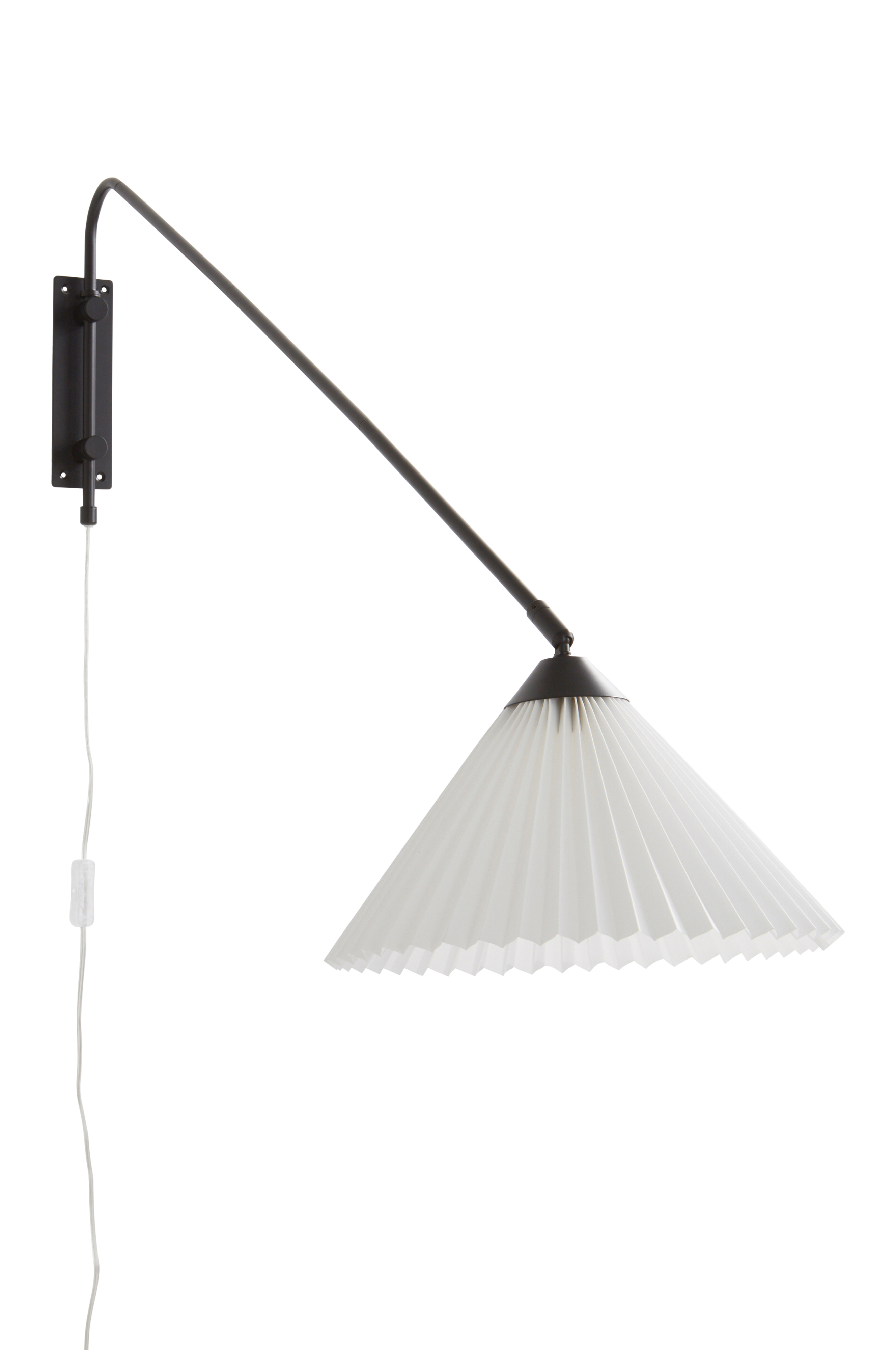 Vägglampan LORI har mattsvart metallfäste som låter lampan hänga en liten bit ut från väggen. Skärmen är en klassisk, veckad textilskärm. Den lite längre armen kan vridas horisontellt så du kan justera perfekt var du vill ha lampan. Strömbrytare på sladden.