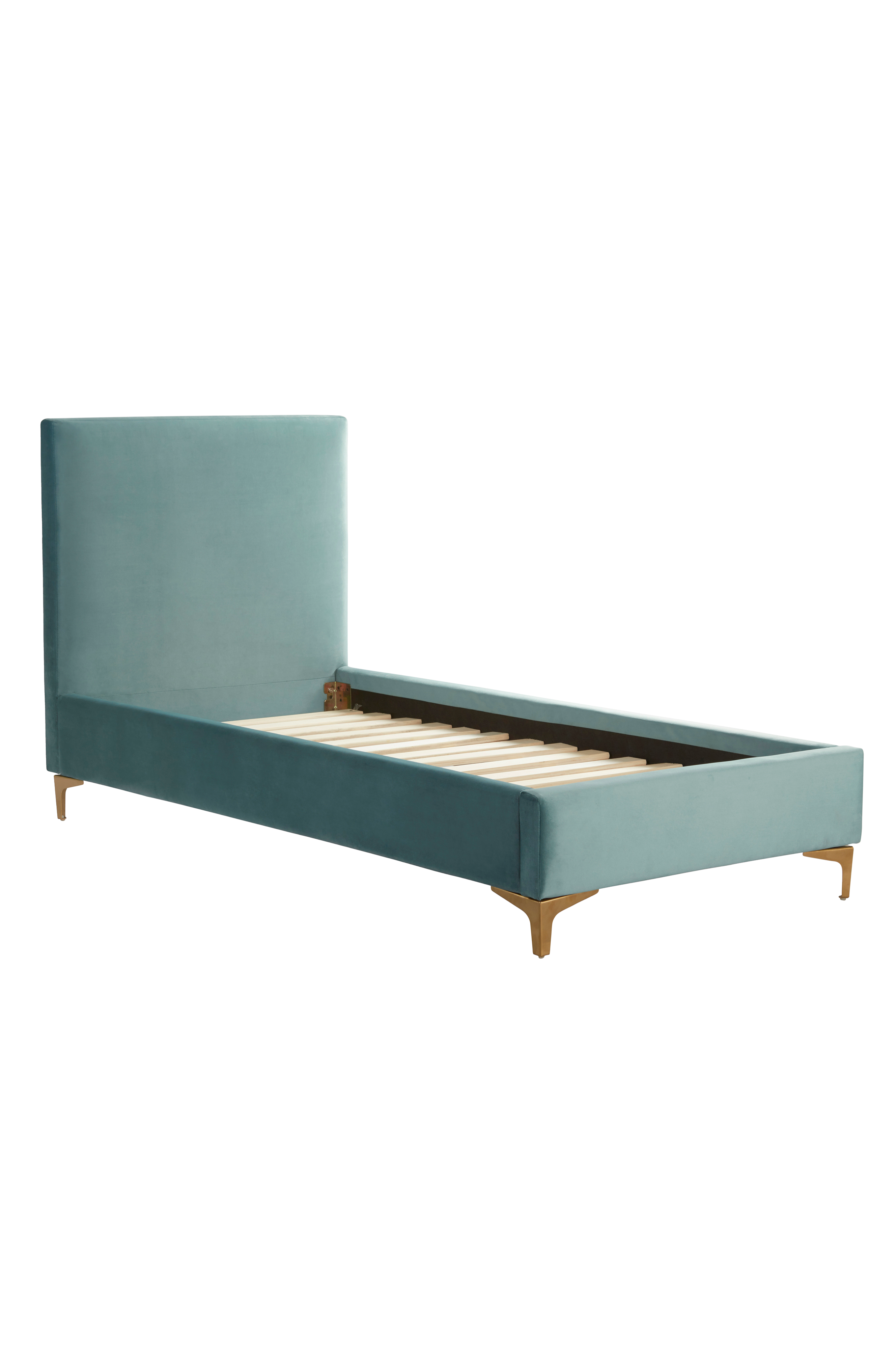 Barnsäng med stoppad gavel klädd i sammet och stilrena mässingben. En perfekt andra säng efter det att barnet har vuxit ur spjälsängen. Tygets slitstyrka är på 28000 Martindale. Används med madrass i storleken 70x160 cm. Madrass ingår ej. Viss montering krävs. Monteringsanvisning medföljer.