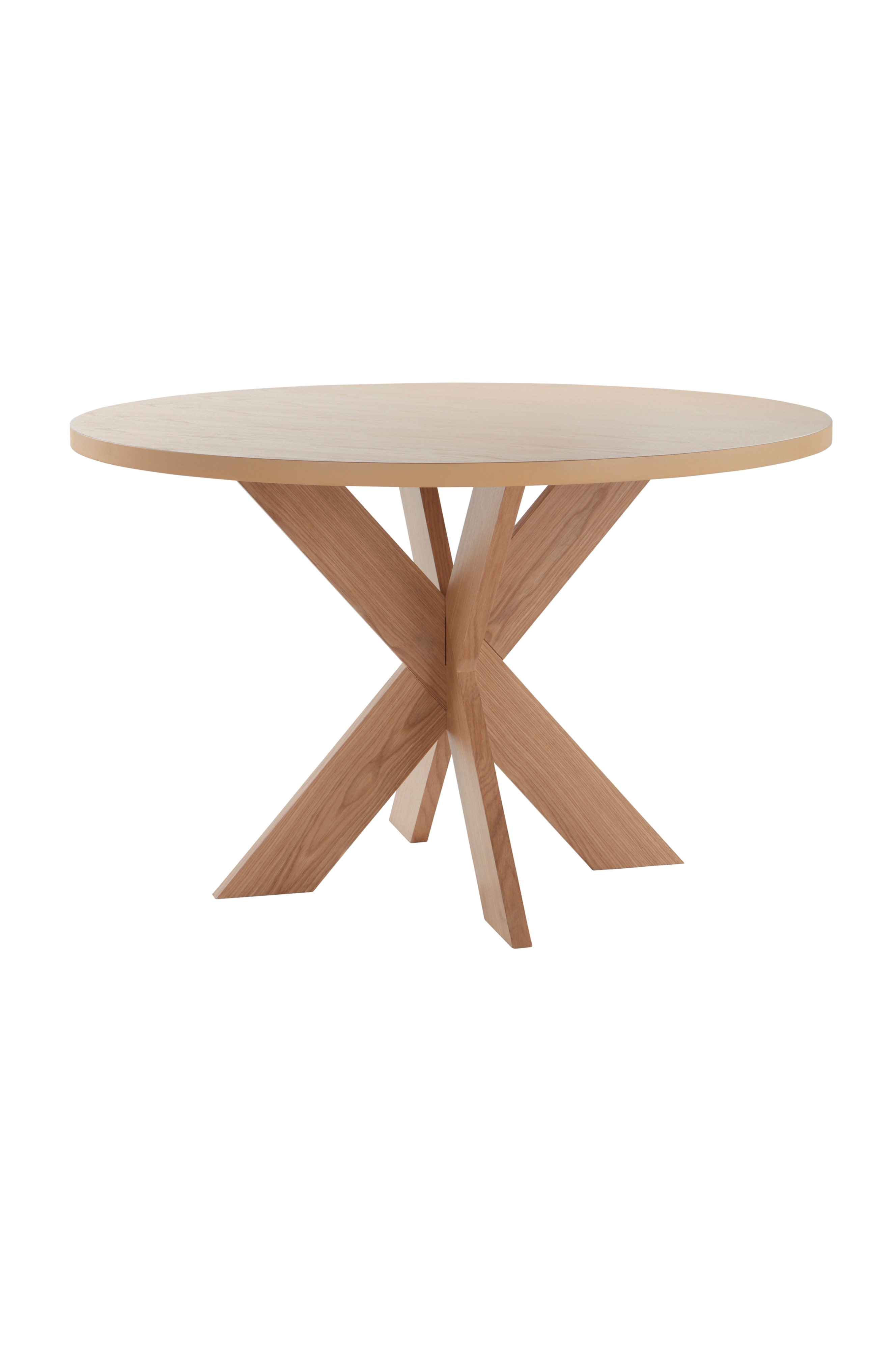 Runt bord av MDF. Det eleganta bordet har kryssunderrede, både snyggt och praktiskt. Det ger mycket plats för benen. Bordet finns i två utföranden. Det träfärgade har fin ekfaner. Det vita har matt vit yta med vattenbaserad lack som ytskikt. Viss montering krävs. Monteringsanvisningar medföljer.