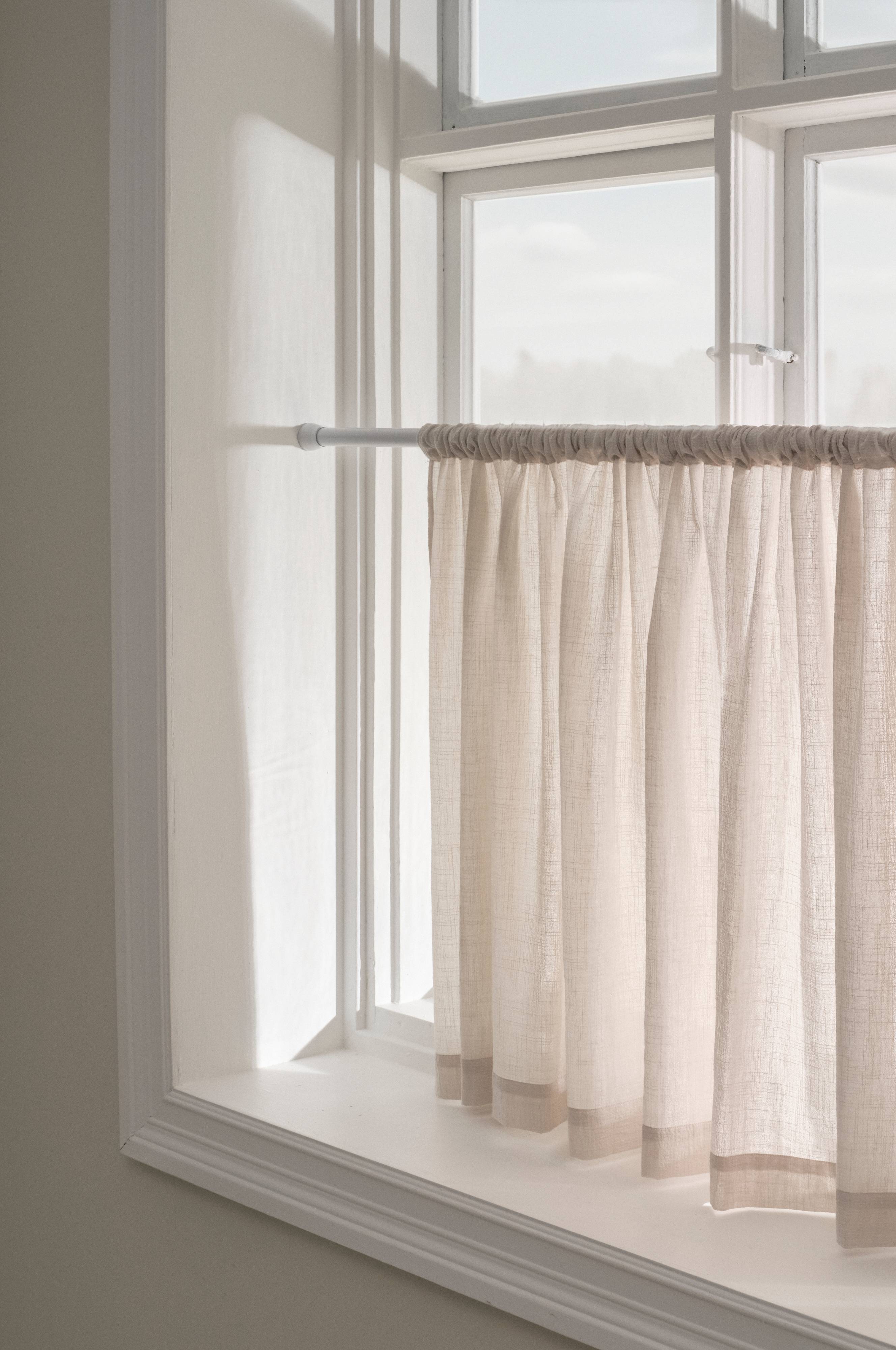 En cafégardin i luftigt tyg med melerad effekt. Tyget är vävt i bomull och har en skönt avslappnad känsla. Cafégardinen LUNI har en sydd kanal upptill och den hängs på gardinstång nedtill i ditt fönster och ger på så sätt insynsskydd samtidigt som ljuset kommer in ovanför gardinen, härligt att alltid se himlen.