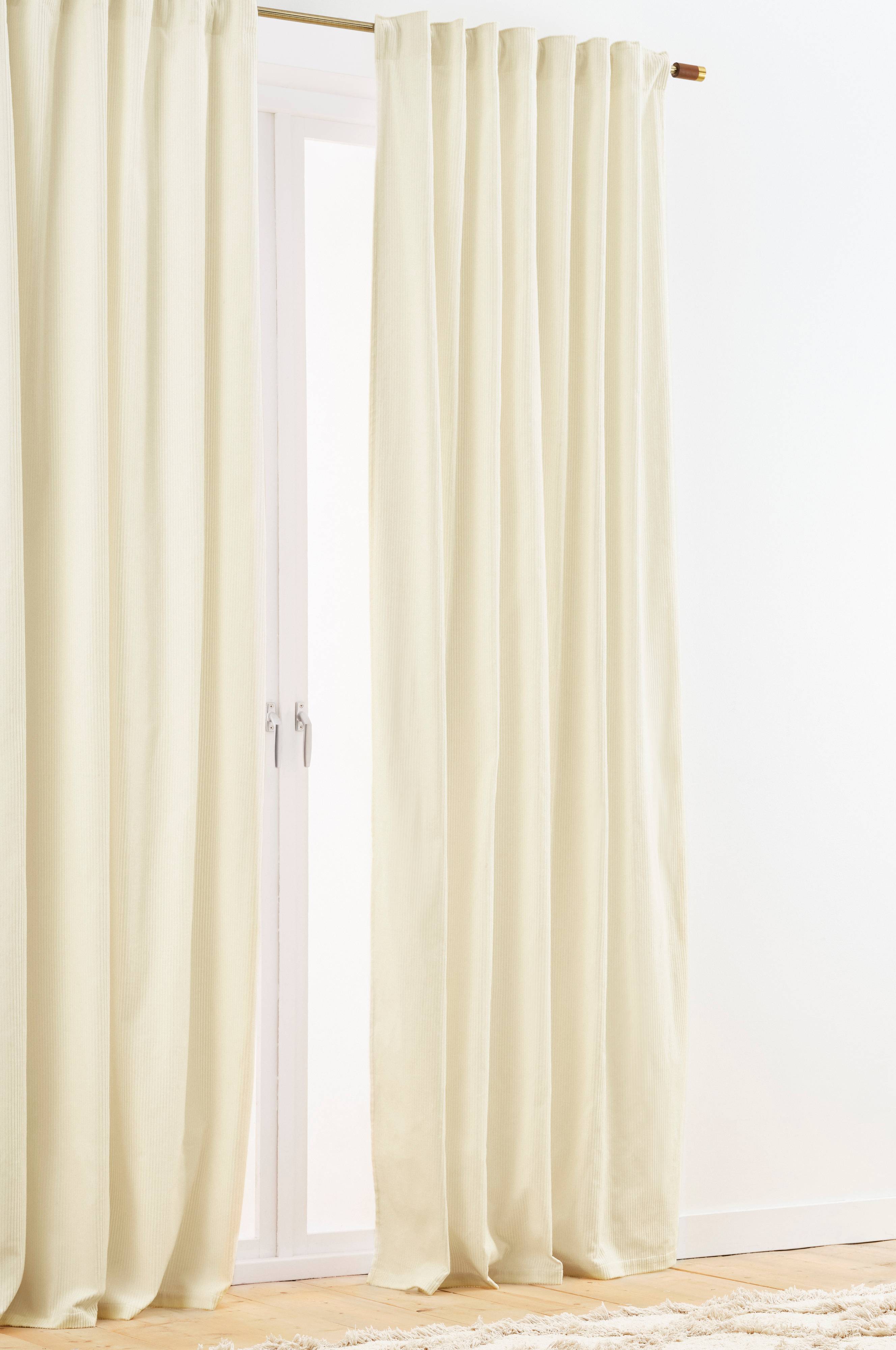 Två gardinlängder i manchester av bomull, ett härligt tyg som är trendigt och samtidigt kan väcka härlig nostalgi. Manchestern är bredspårig och längderna får tyngd och faller fint. Längderna har påsytt multifunktionsband och kan hängas upp med fingerkrokar, kanal samt dold hälla.