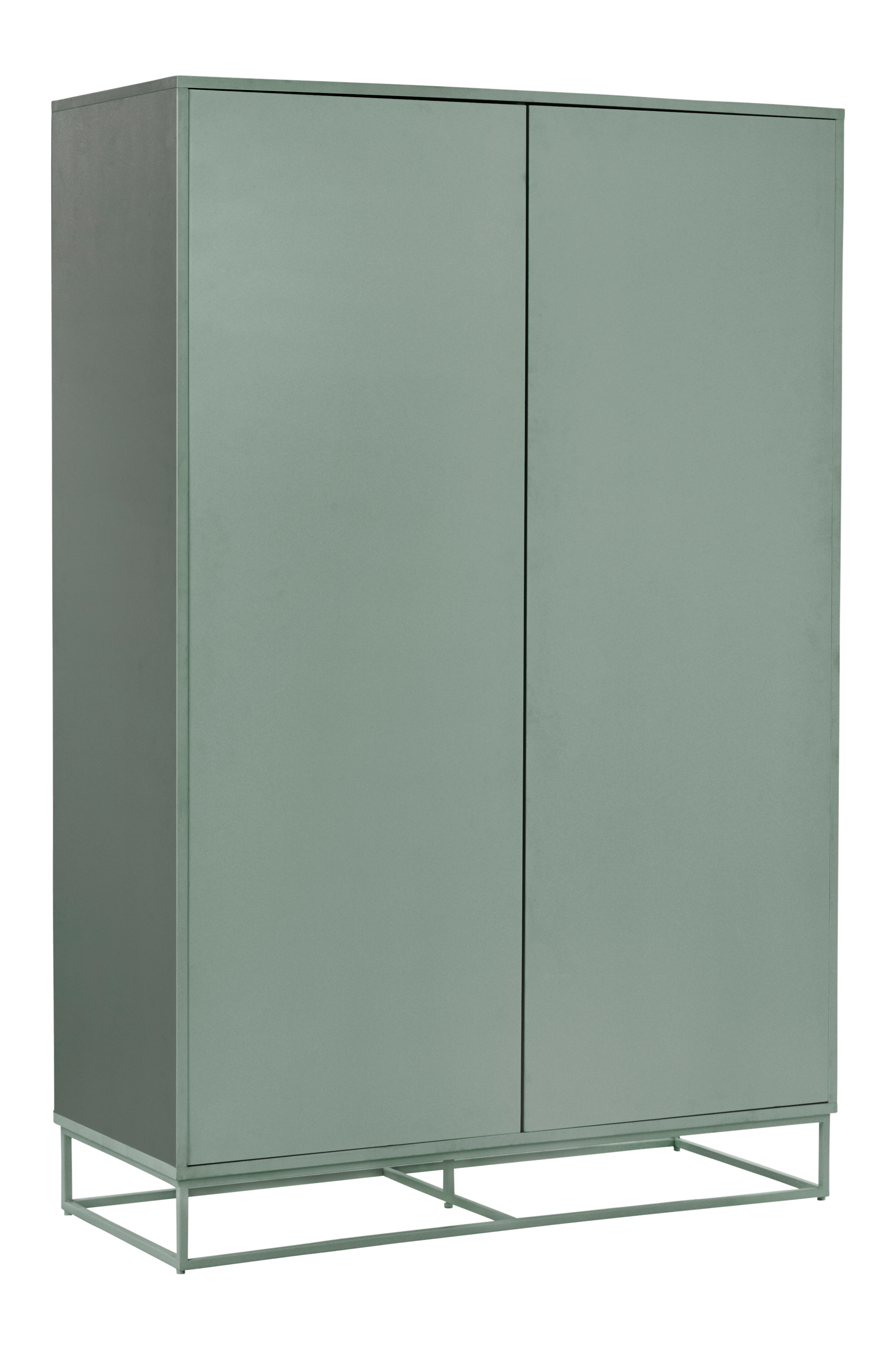 Garderob av MDF med underrede av metall. Den avskalade och stilrena garderoben har två dörrar med pushfunktion. Det gör att garderoben är helt slät utan handtag och ändå lätt att öppna. Garderoben är tvådelad. Den vänstra delen har klädstång av massiv bok och en fast hylla. Den högra delen har tre flyttbara hyllor. Delarna av MDF har vattenbaserad lack. Underredet är av fyrkantsprofil med pulverlack. Väggfäste gör att skåpet kan fästas i väggen vid behov. Viss montering krävs. Monteringsanvisning medföljer.
