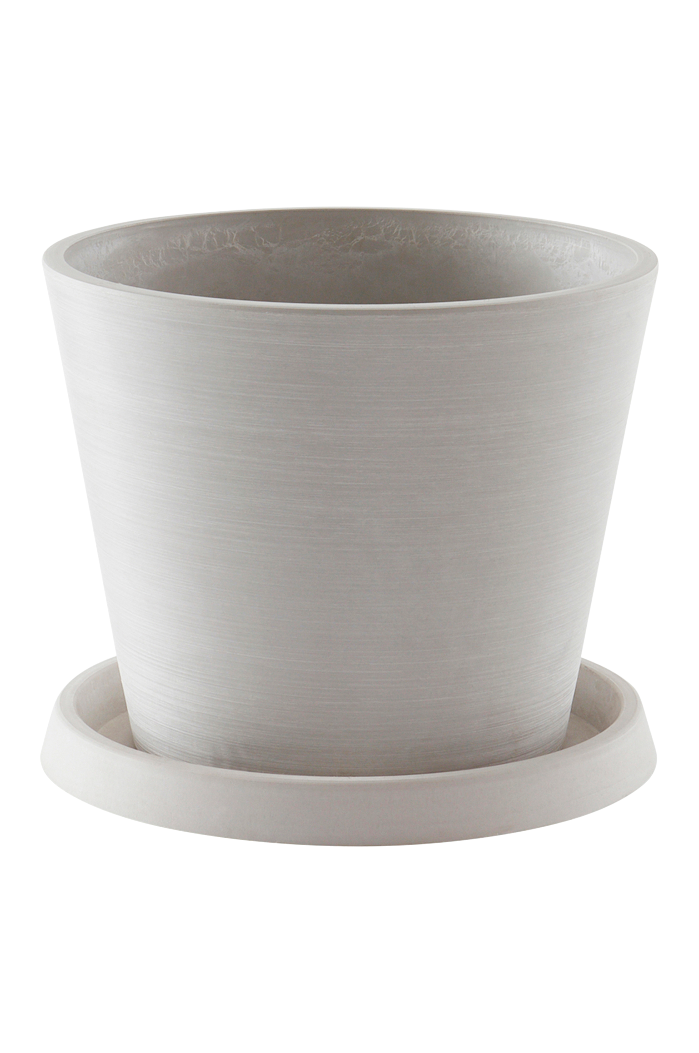 Kruka och fat i rak, stilren modell i ett mycket lätt och tåligt material som fungerar både ute och inne. Krukan och fatet är vädertåliga och tål frost, de blir inte blekta av solljus och är dessutom återvinningsbara.