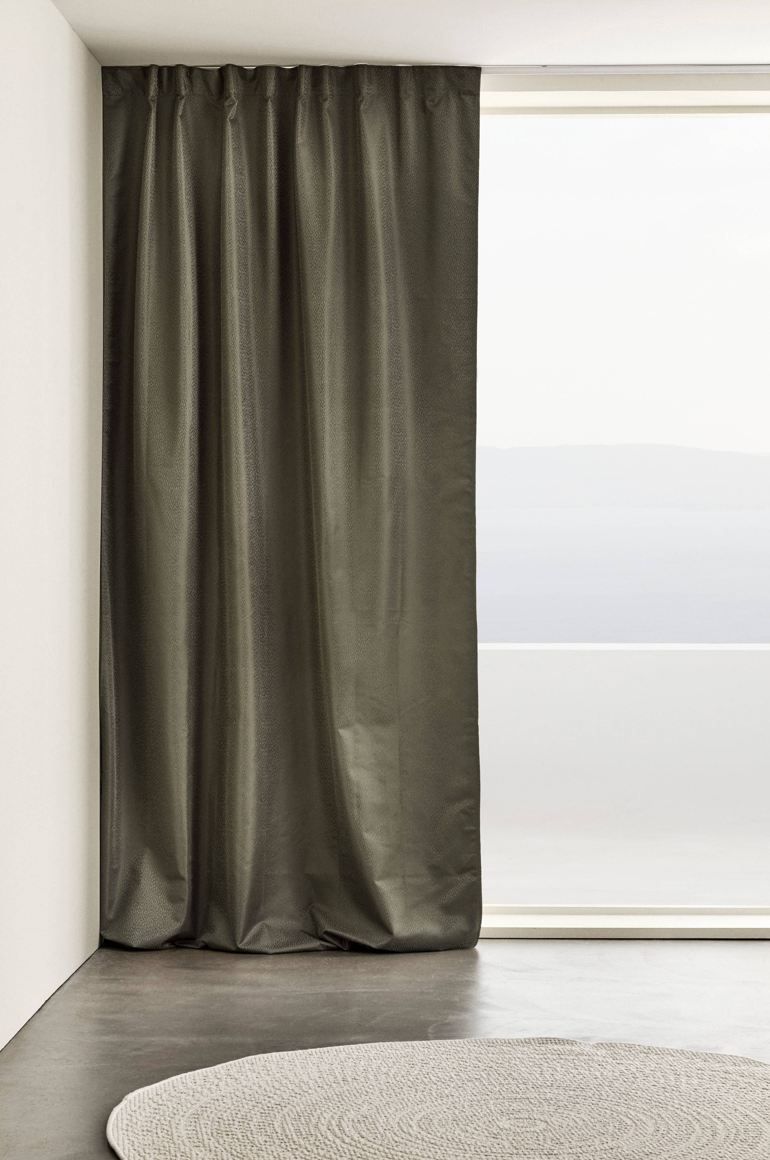 En mörkläggande gardinlängd (funktionsgardin) av polyester, hälften kommer från återvunnet material. Tyget blockerar ut ljuset och mörklägger sovrummet, tv-rummet eller barnkammaren. Gardinlängden har diskret mönster ton i ton. Ljusblockerande beläggning på baksidan. Längden har påsytt multifunktionsband och kan hängas upp med fingerkrokar, kanal samt dold hälla.