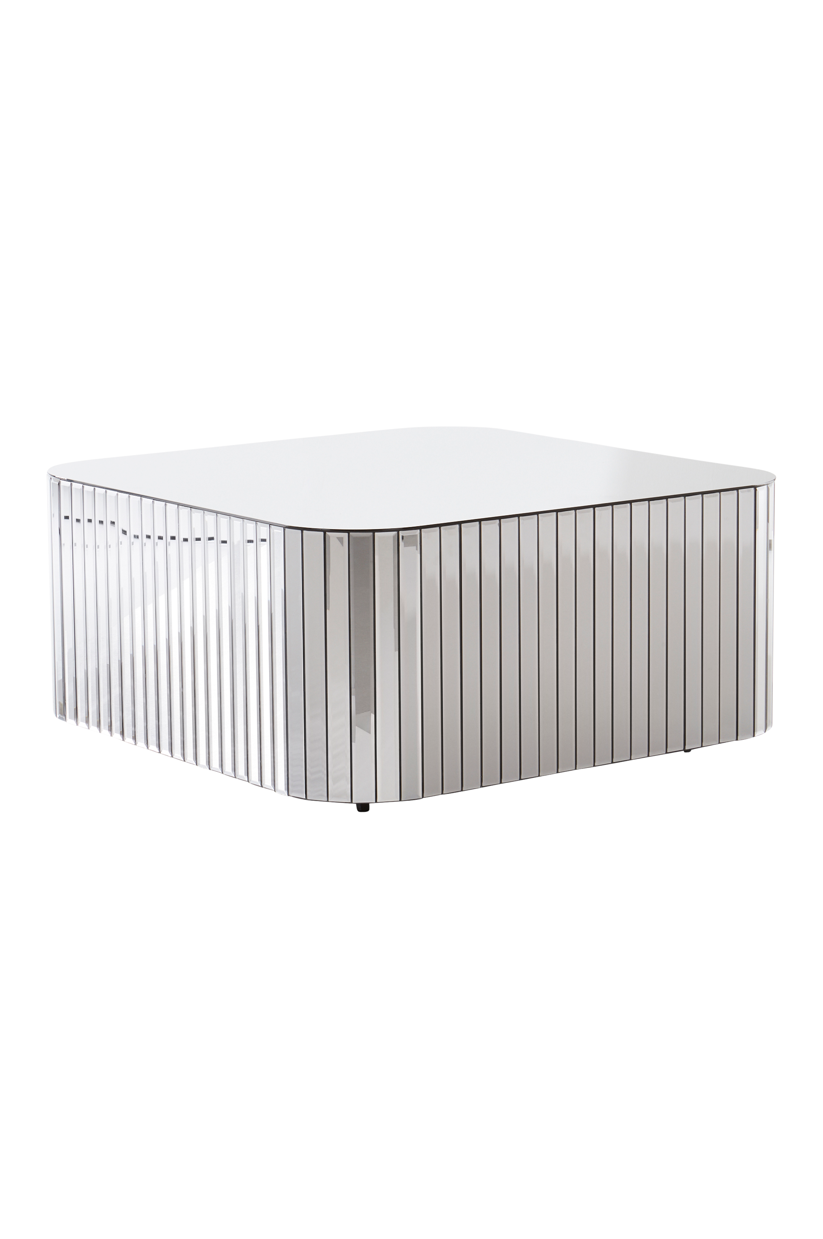 Kvadratiskt soffbord med bordsskiva och stående paneler runt om av rökfärgat glas. Bordets hörn är rundade och glaspanelerna på sidorna har fasade kanter. Stommen är av FSC-märkt MDF.