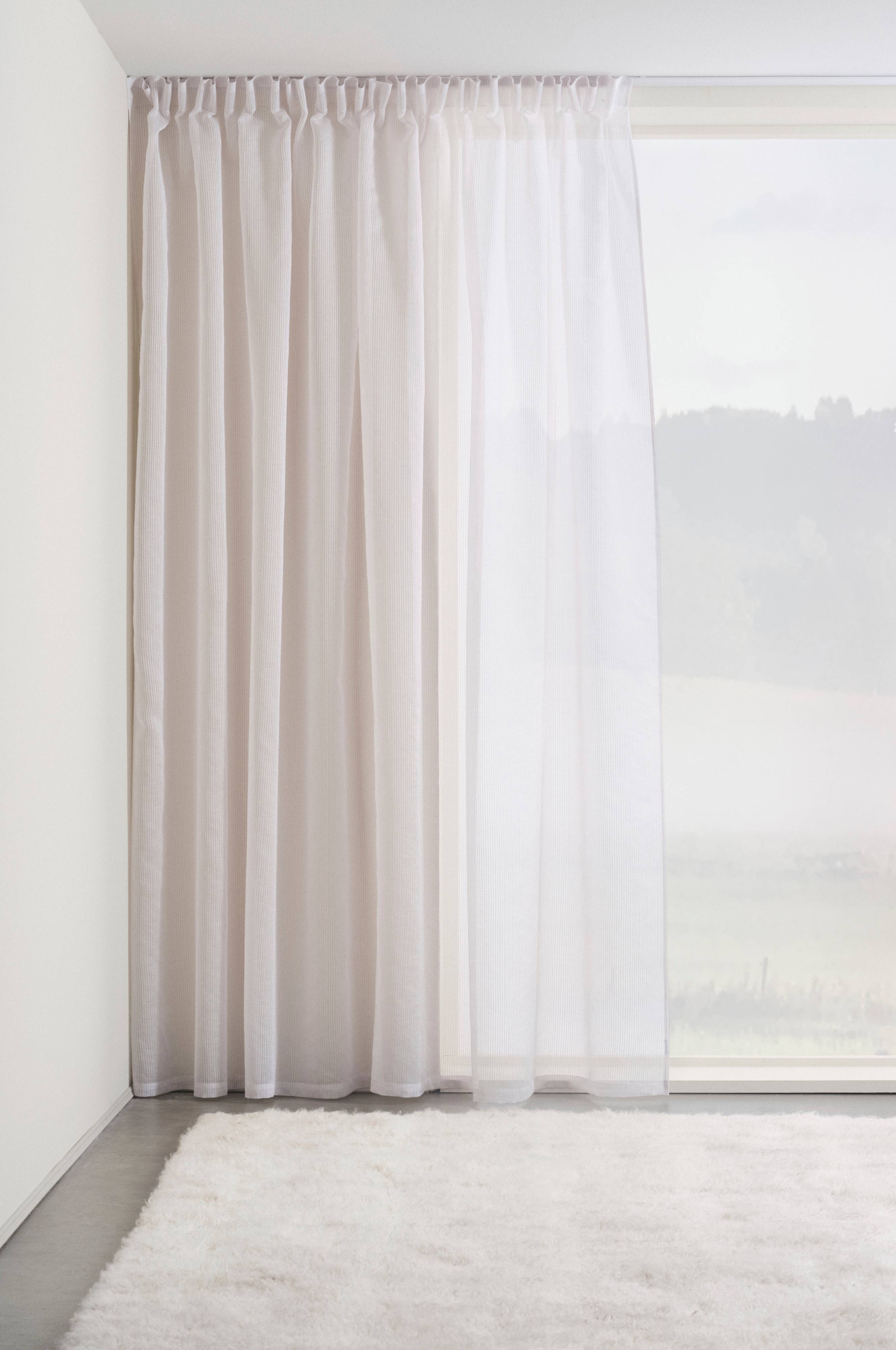 En extra bred gardinlängd i fin kvalité av polyester som faller snyggt. Tyget är vävt lite skirare och den diskreta randningen kommer av att en glansig, aningen tjockare tråd vävts in. Gardinlängden har påsytt multifunktionsband och kan hängas upp med fingerkrokar, kanal samt dold hälla. Fåll nedtill som är 3 cm.