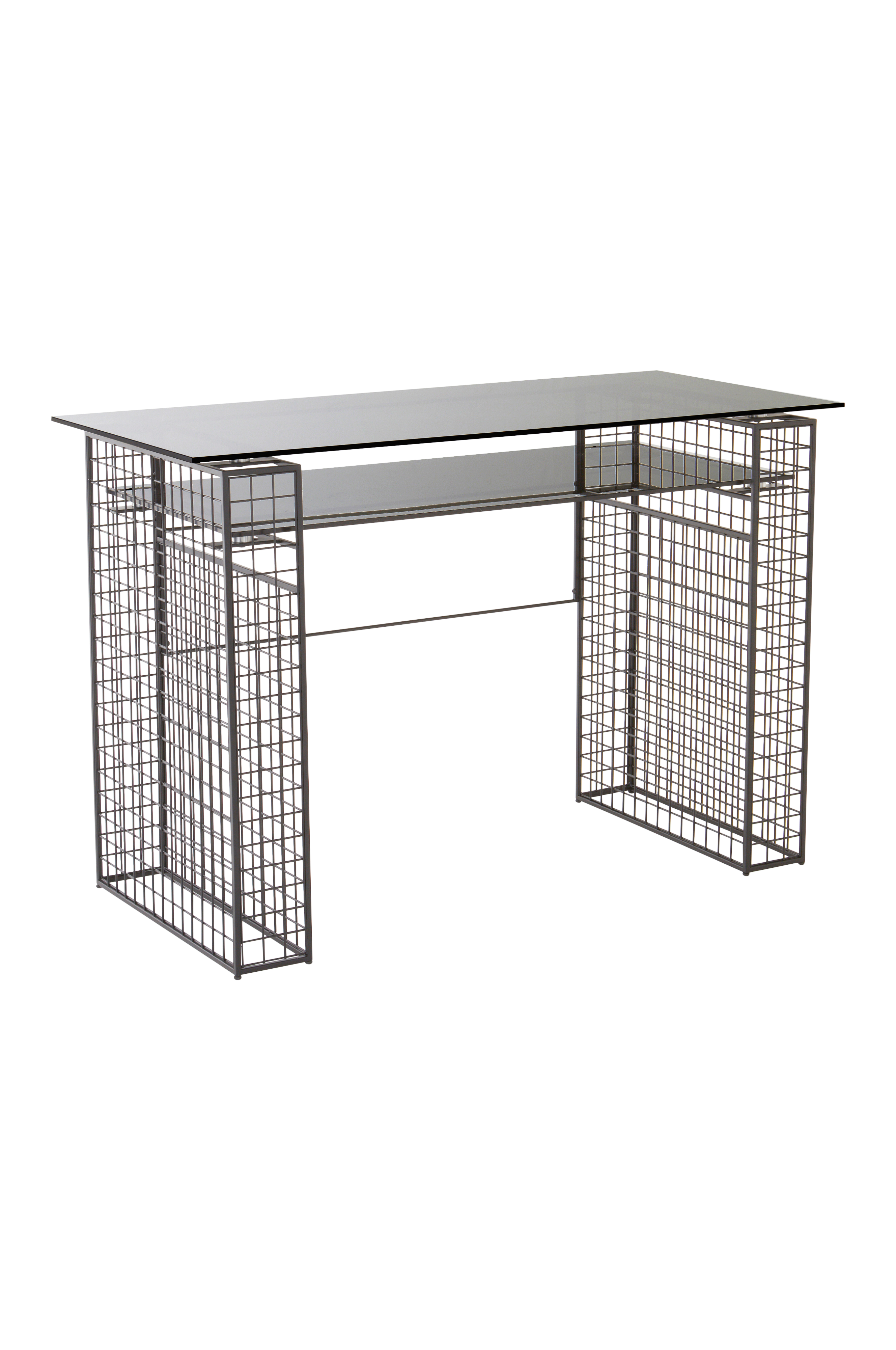 Skrivbord i snygg, innovativ modell av järngaller med glasskivor. Ett snyggt skrivbord är ett måste för hemmakontoret som ska få plats på liten yta, MEKKO är helt perfekt för det ändamålet. Skrivbordet har bordsskiva av glas, och under den ytterligare en praktisk skiva av glas där du kan ställa in tangentbord, anteckningsblock och annat när arbetsdagen är slut. Sidorna har en stomme av järn och nät av järnvajer, med kromad finish eller svart lack. Benens höjd kan justeras så bordet står jämnt på ett ojämnt golv. Viss montering krävs. Monteringsanvisning medföljer.