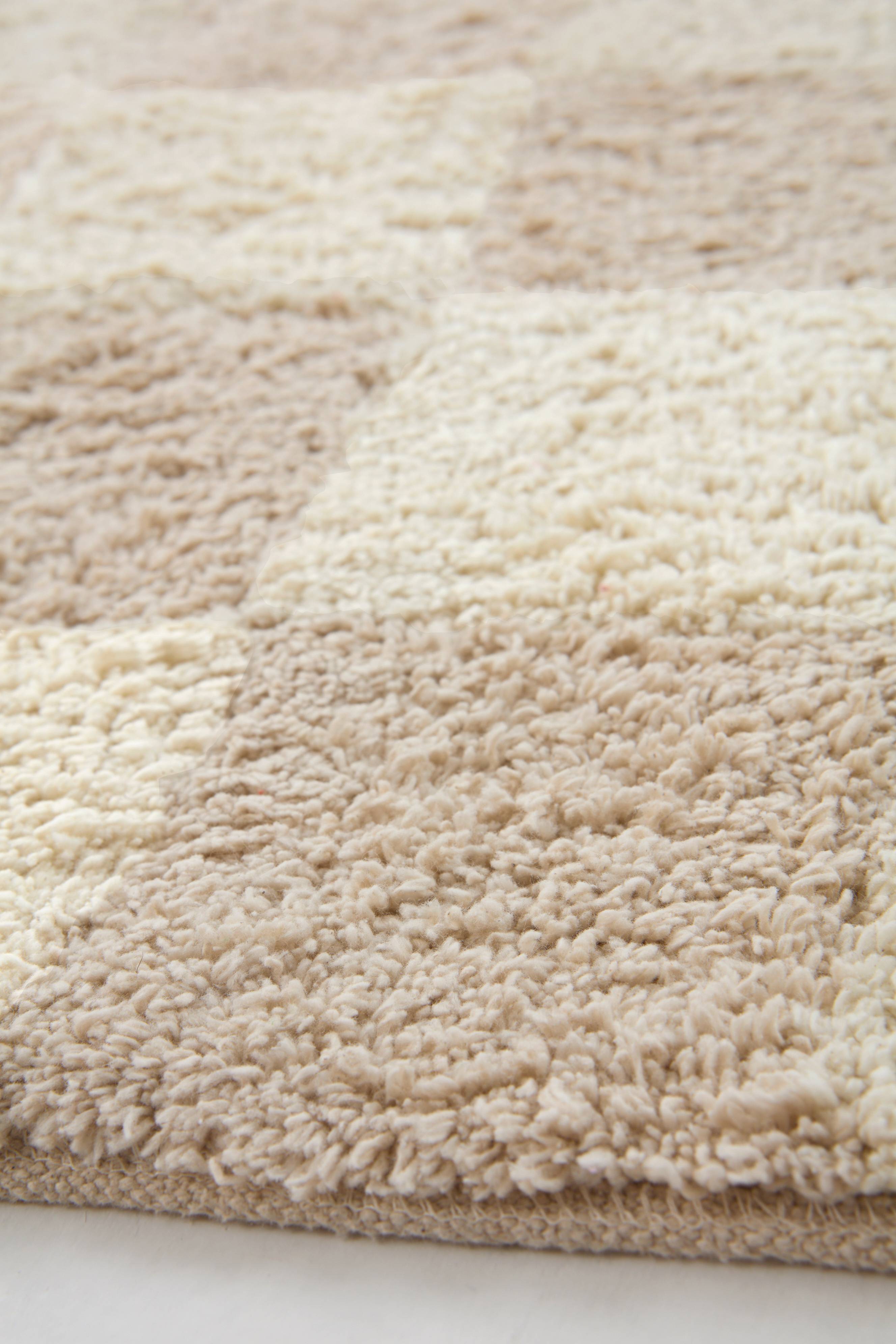 Badmattan MELA har en rutig design med färgade rutor och en tuftad, mjuk textur. Bakstycket i spraylatex gör att mattan håller sig på plats.