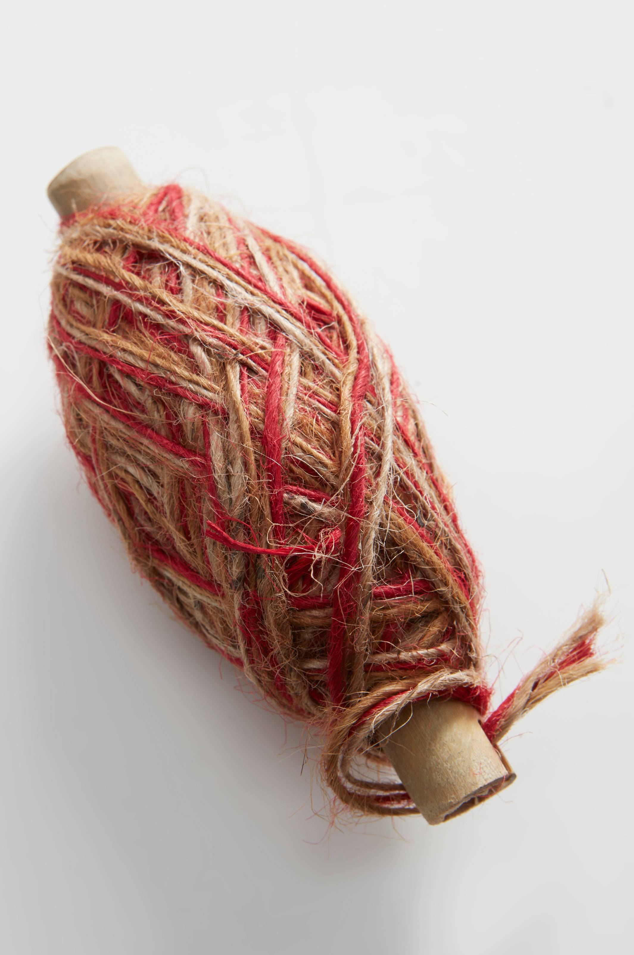Tvåfärgat jutesnöre på trärulle. Jutesnöre ger en skön vintagekänsla till dina kreativa projekt och kan användas till presenter och blomsterarrangemang och allt där emellan. Rullen innehåller 50 meter.