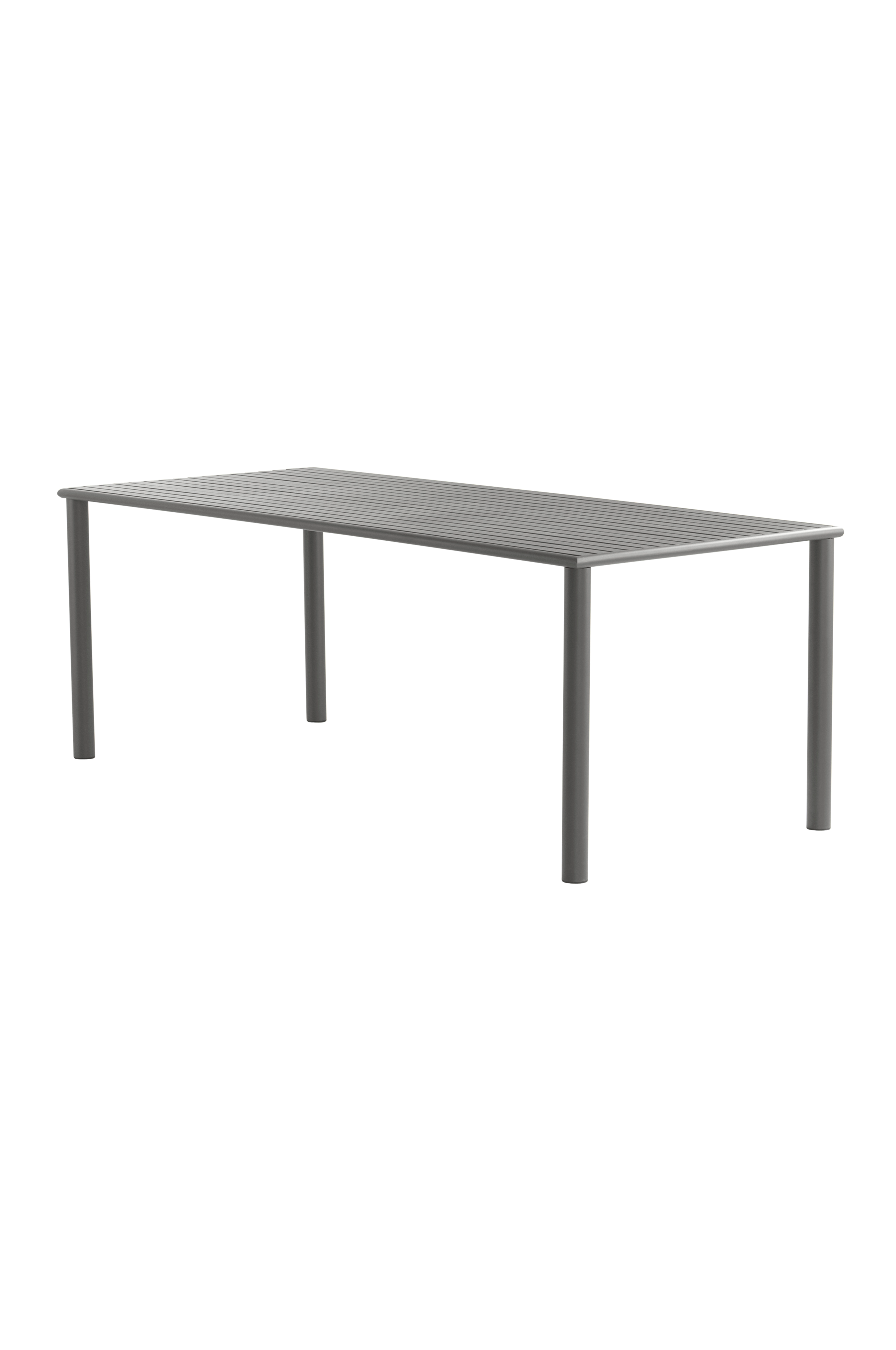 Matbord av pulverlackerad aluminium med matt yta som inte bländar i solskenet. MENTON tål att stå utomhus och det gör utelivet enklare. Du slipper bära så fort du vill sitta ute. Möbeln är nätt och ger en skön känsla på altanen eller uteplatsen. Låg vikt.