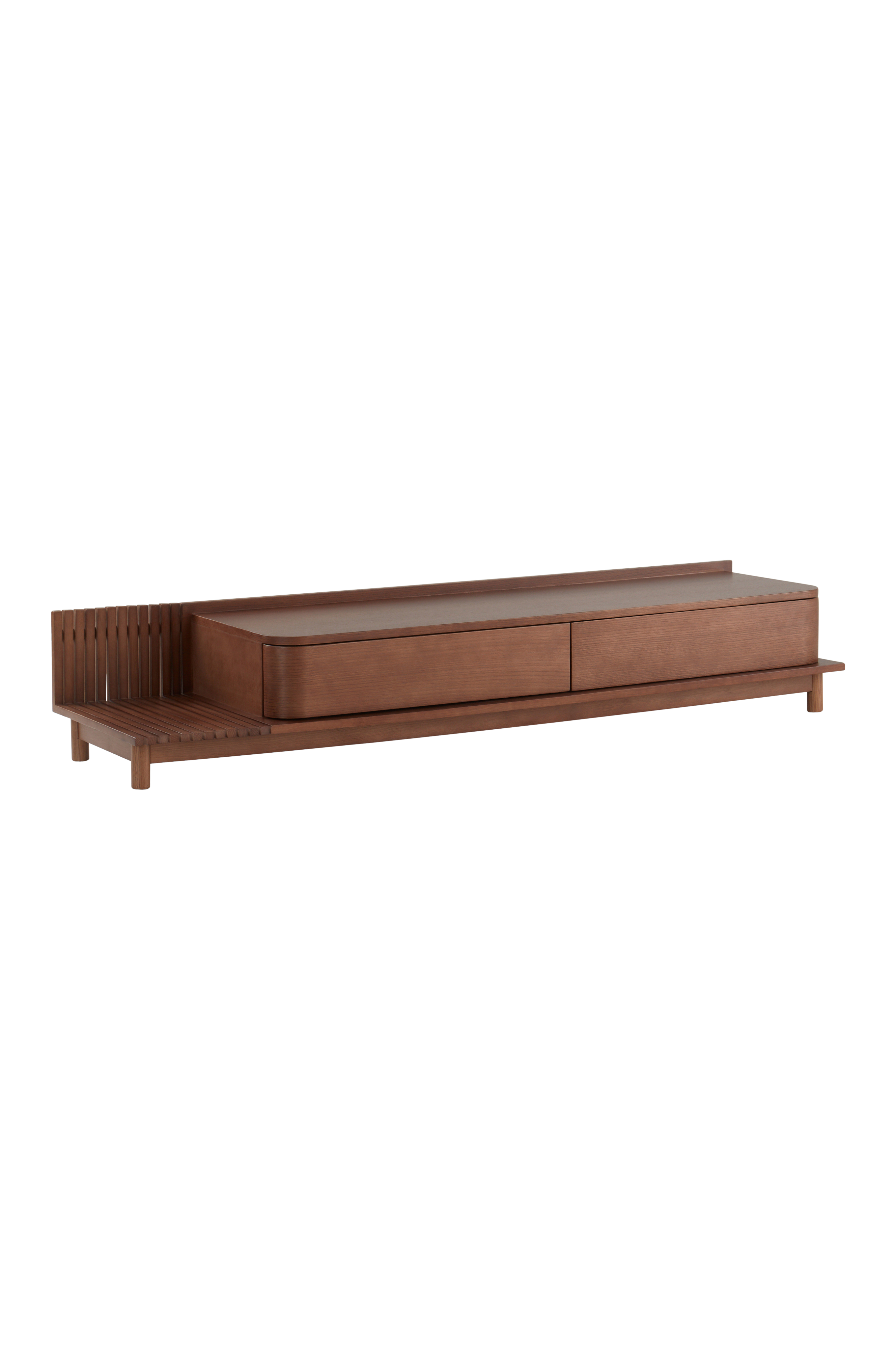TV-bänk av massiv ek i kombination med MDF med matchande ekfaner. Den låga möbeln är i snygg design med runda hörn och mjuka linjer som kan föra tanken till den japanska stilen. Tv-bänken har två lådor och en liten sidohylla för praktisk förvaring. De runda raka ekbenen är fem till antalet. Möbeln är behandlad med vattenbaserad lack. Viss montering krävs. Monteringsanvisning medföljer.