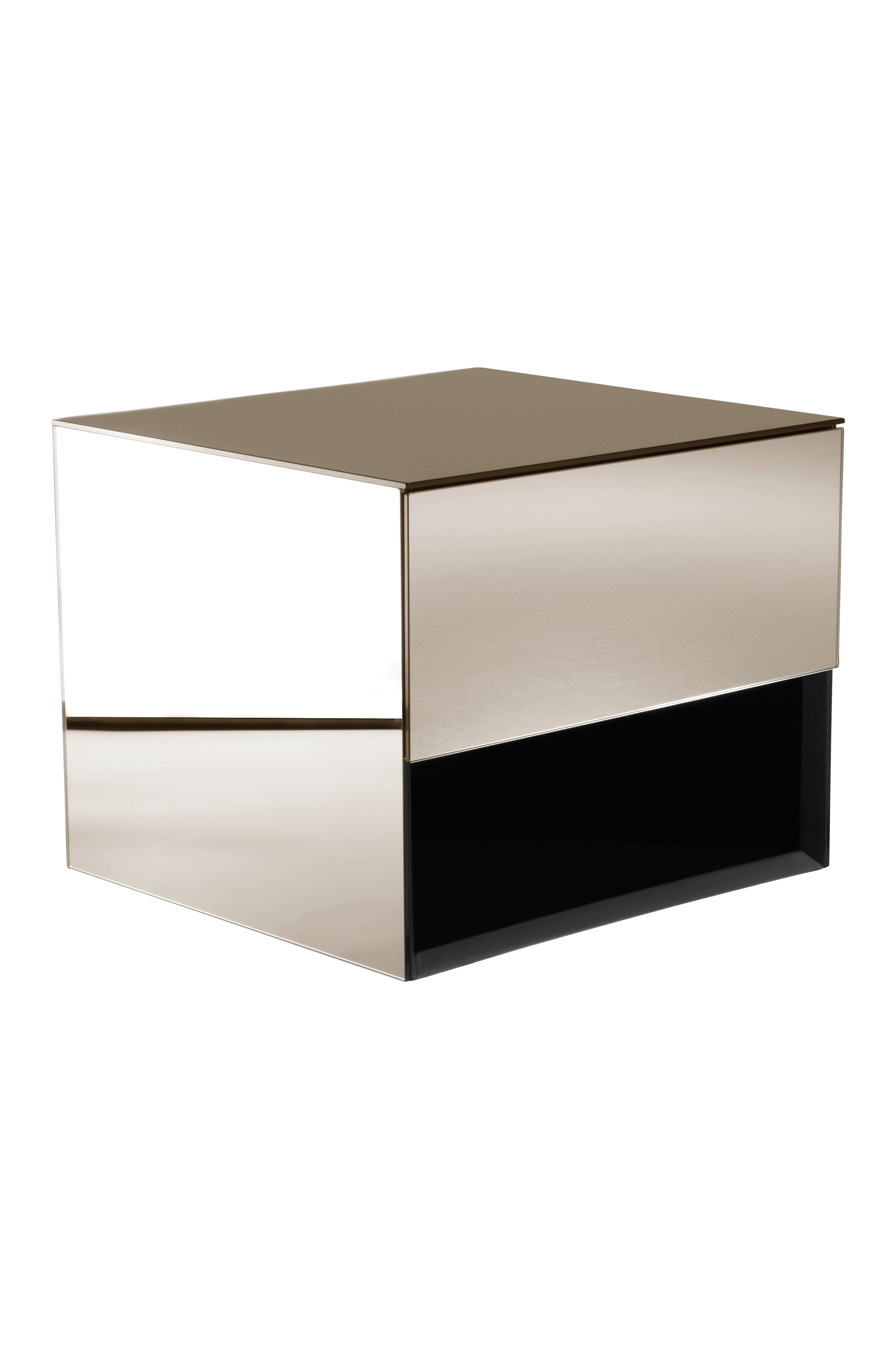 Sängbord av spegelglas med stomme av FSC-certifierad MDF. Detta sängbord är tänkt att hänga på väggen. Bakom spegeln i framkant är det ett dolt skåp och där under en öppen hylla. Dörren har pushfunktion och mjukstängande gångjärn. Invändigt är skåpet svart. Sängbordet är spegelklätt på alla sidor och kanterna är mattsvarta. Bordet är lätt att placera på många olika platser i hemmet utöver att det är ett extraordinärt sängbord.