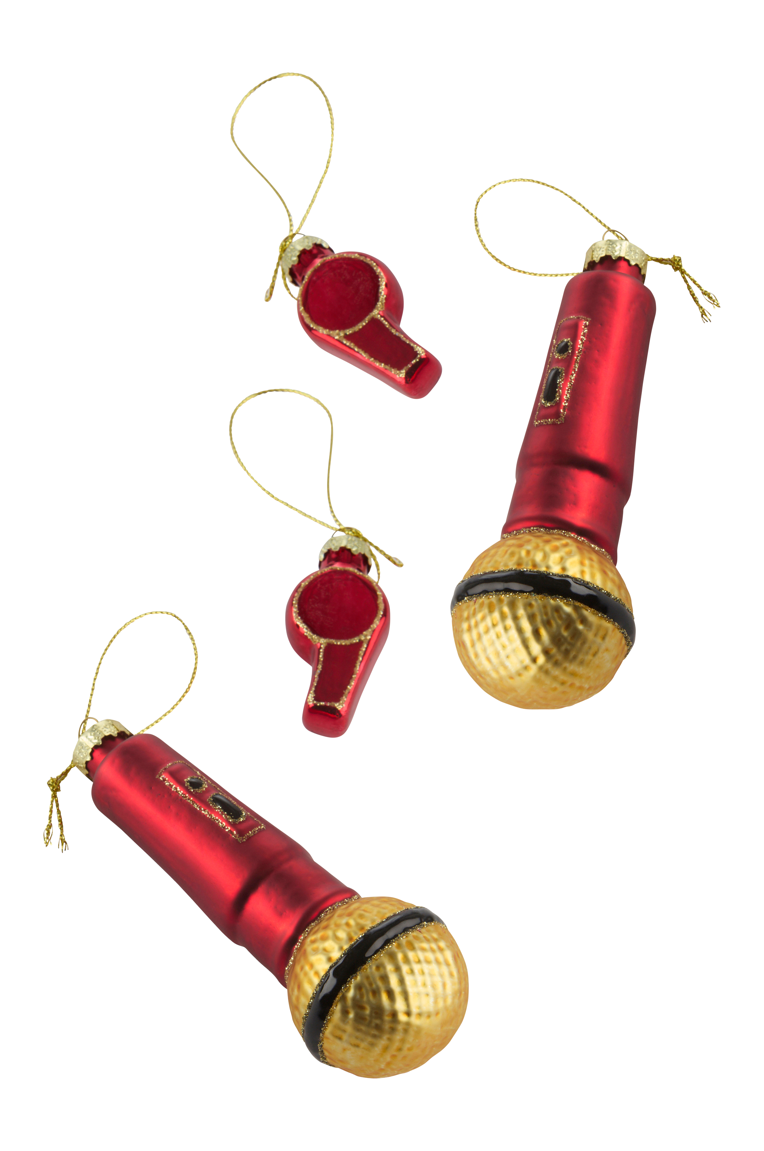4-pack med hängande dekorationer för musikälskare, med två eleganta glasmikrofoner och två visselpipor. Varje del är tillverkad av glas i livfulla färger och är perfekt för att ge en festlig touch.