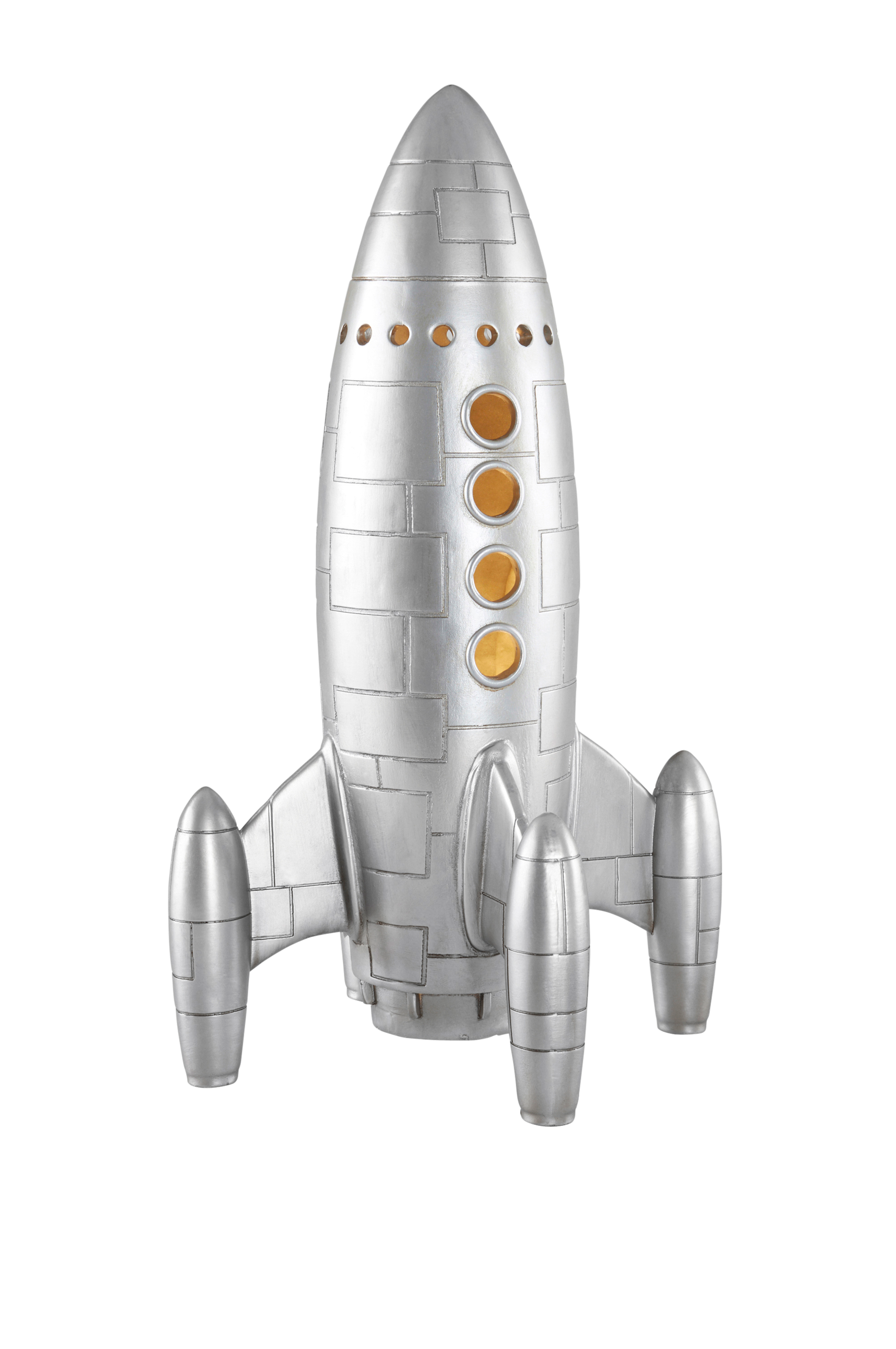 Rymdraket av polyresin med LED-belysning. När raketen lyser ser den härligt välkomnande ut och blir en perfekt nattlampa. Liten av- och påknapp under raketen.