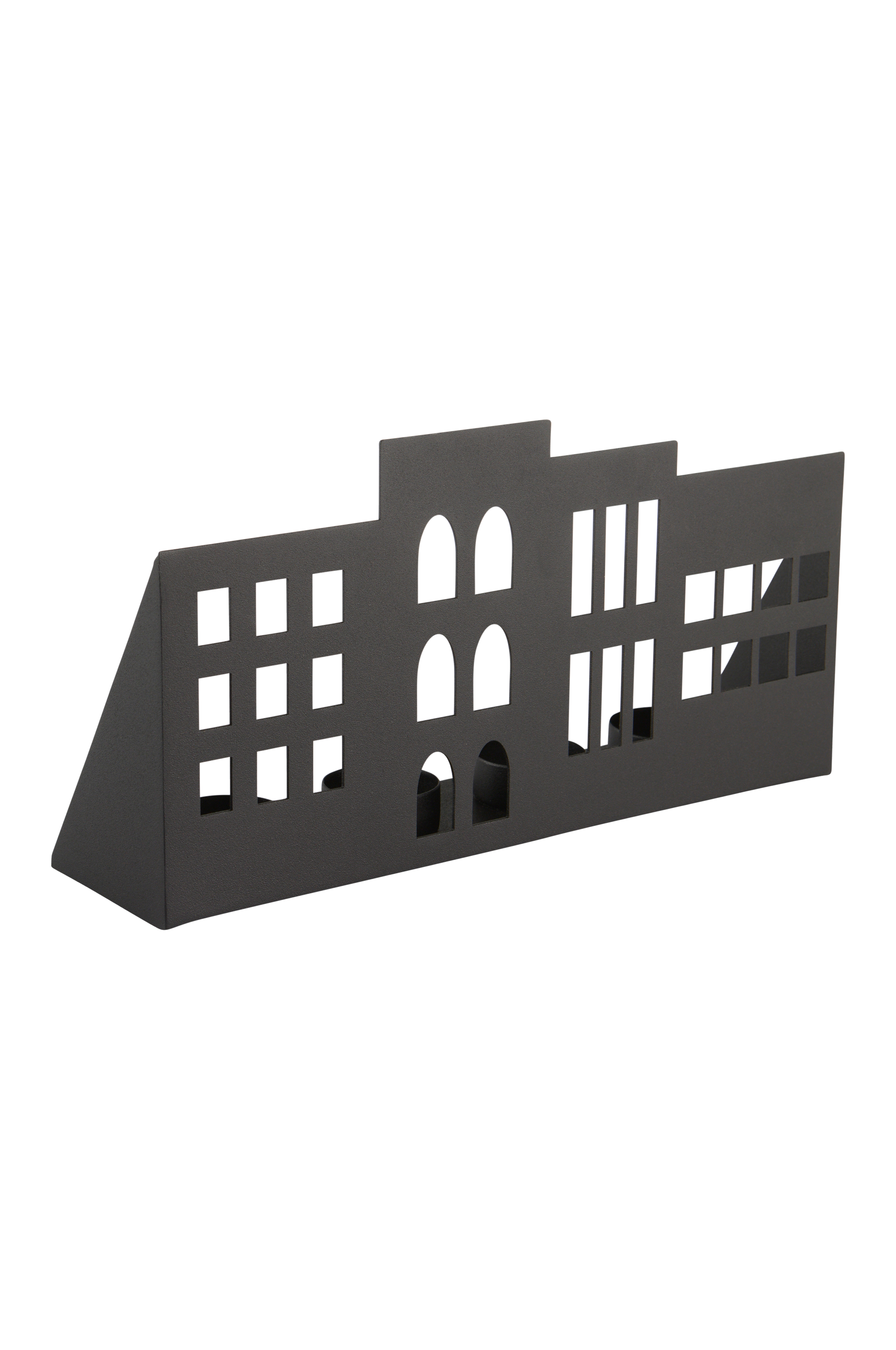 En ljuslykta i järn utformad som en hussilhuett. Den här eleganta ljuslyktan har fyra ljushållare som skapar en varm och inbjudande atmosfär. Perfekt för mysig heminredning.