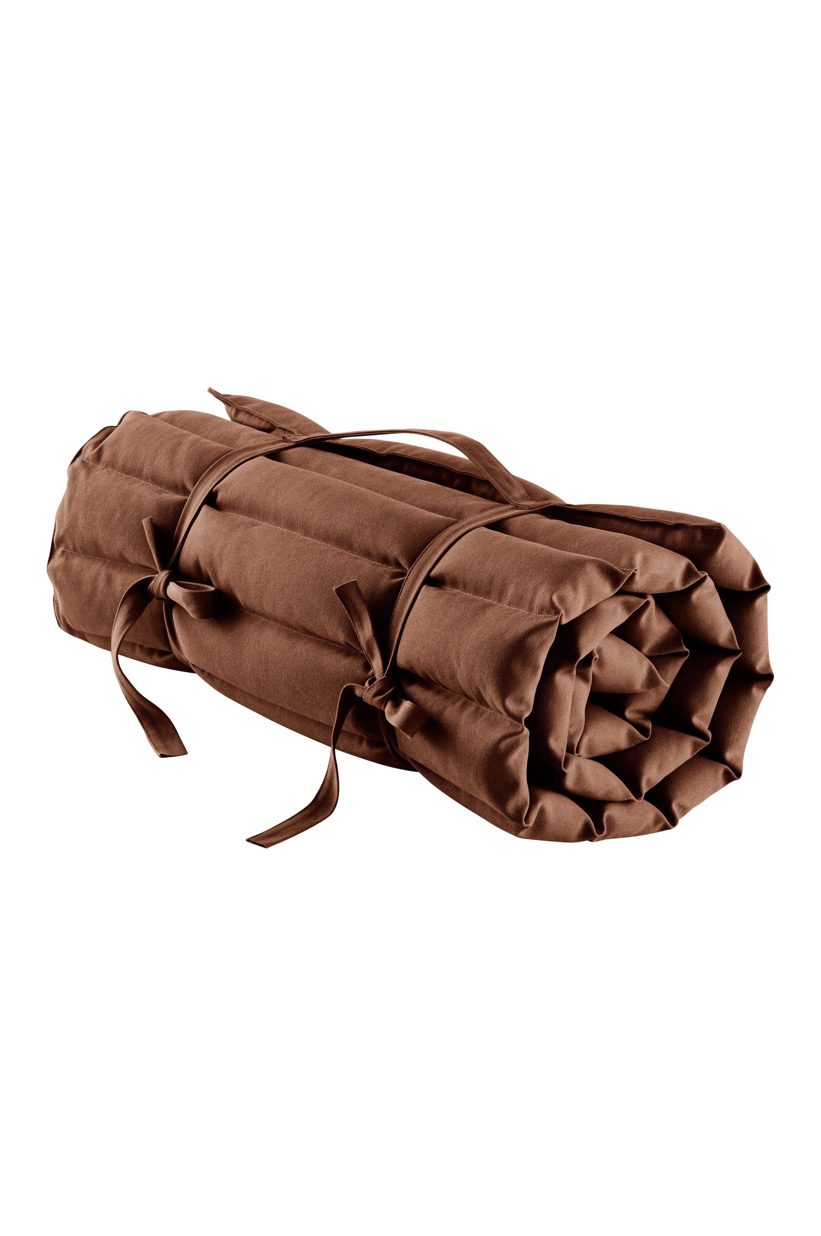 Strandmadrass med yttertyg i tvättad canvas av återvunnen bomull och polyester. Fyllningen är av polyester. Madrassen är kanalquiltad så att fyllningen hålls på plats och den blir också enklare att rulla ihop. Knytband runt om och bärhandtag gör den smidig att ta med.